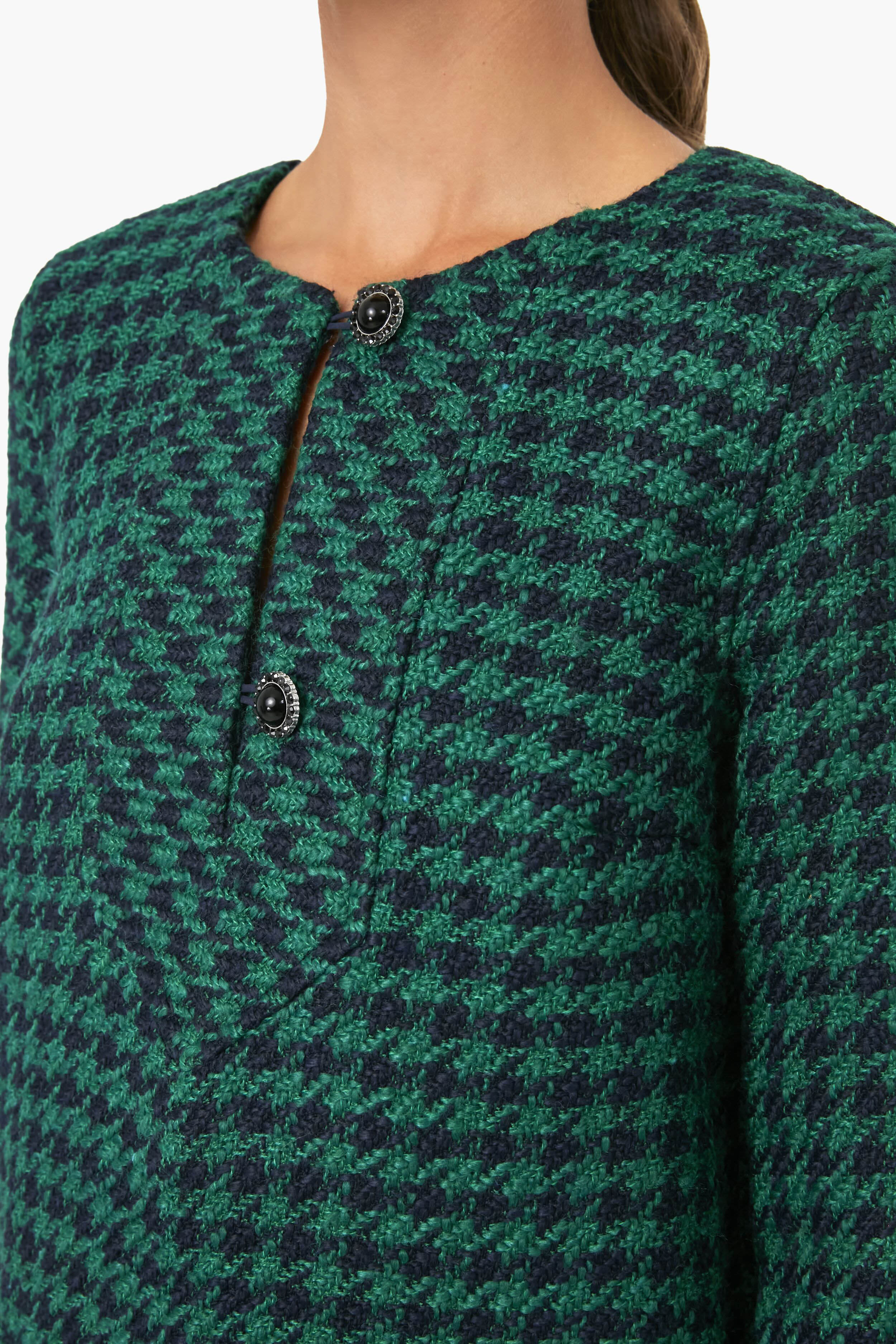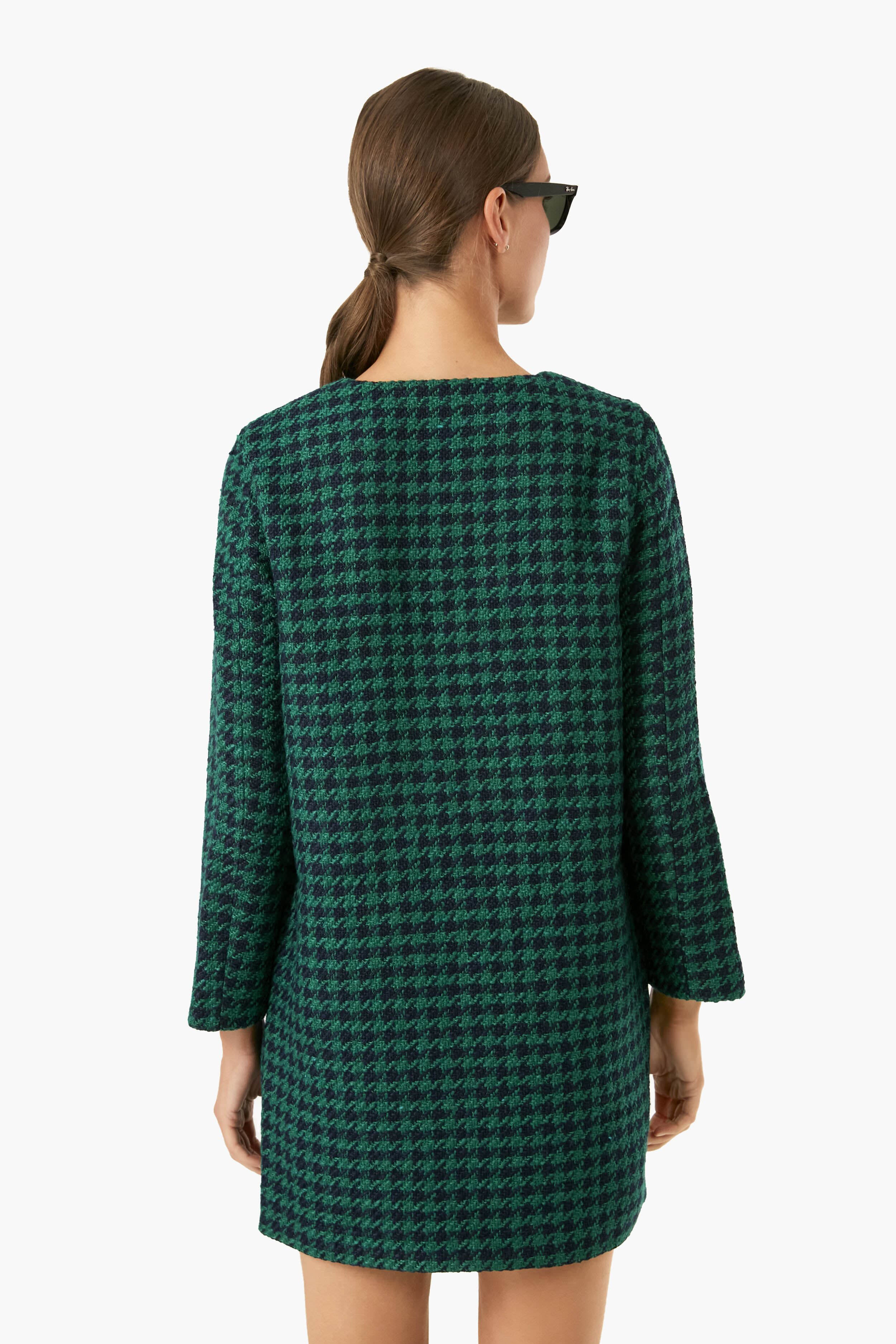 The Green Check Ayla dress is a bouclé mini that features long sleeves. a button front placket. and front patch pockets. In a houndstooth pattern and fully lined. this classic number is a combination of bold. cool-girl prep. Pair it with boots and a sunnies for a striking. city chic look.