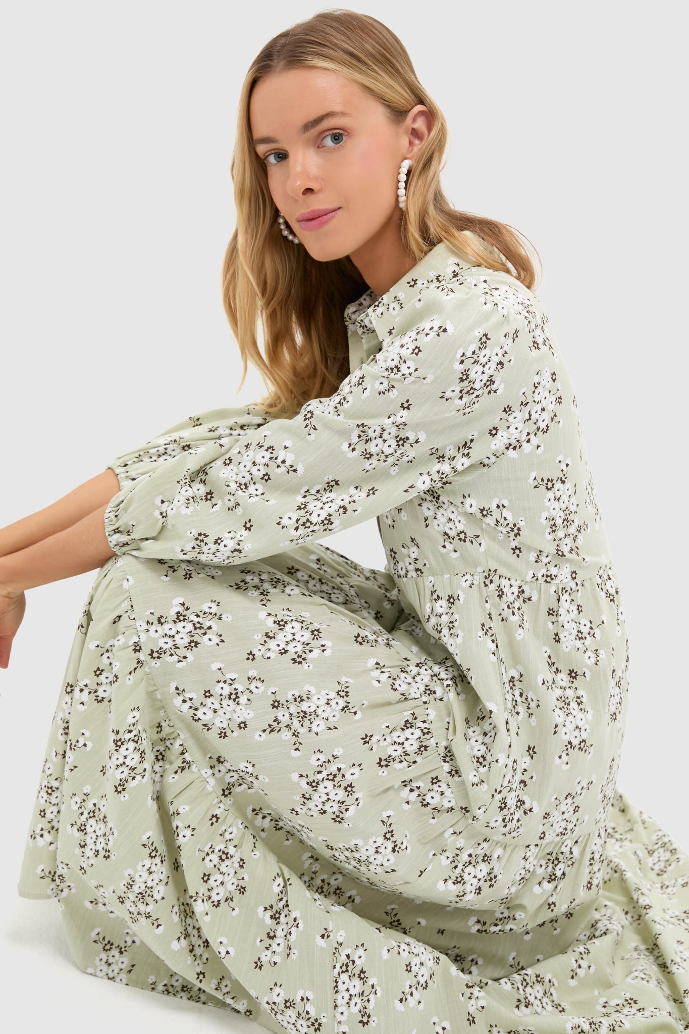 The Green Ditsy Floral Mabel Maxi Dress is ready to quickly become a closet staple. Featuring a collared neckline. three-quarter length puff sleeves. and a full length tiered skirt. this effortless number has a sophisticated yet fun feel to it. Wear this no-fuss maxi all day. from coffee dates to dinners with friends. and make your day a breeze with this easy silhouette.