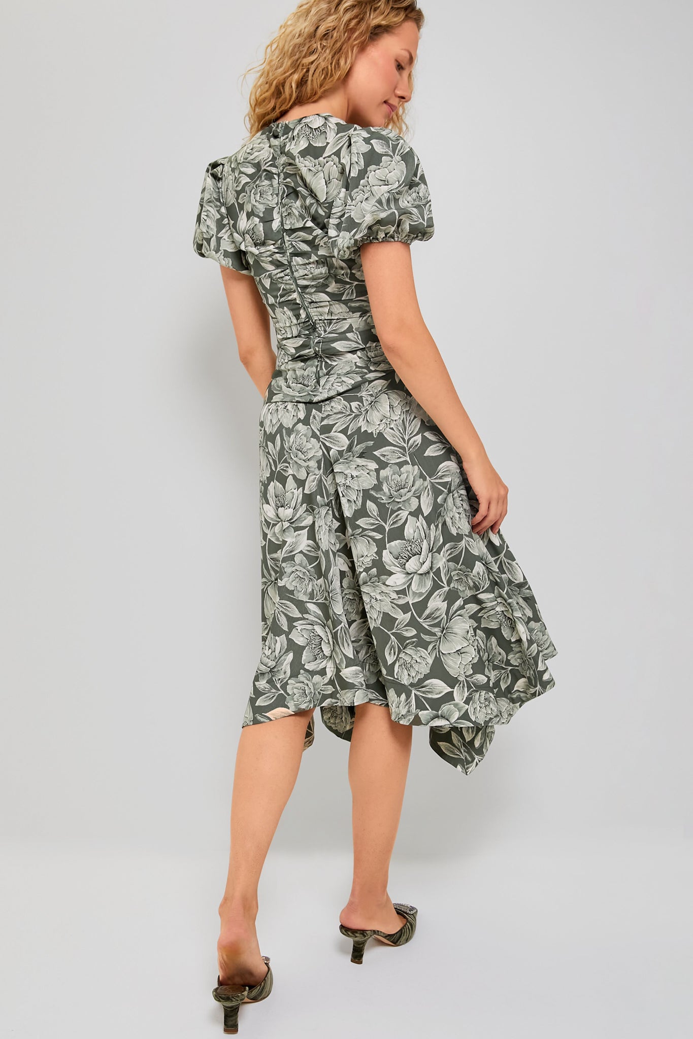 Popped with pretty puff sleeves with center ruching and asymmetric hem. the Green Multi Midi Dress is a year-round style that can be worn to countless occasions. We love to pair it with a sweater thrown over the shoulders. with sandals or boots. and gold jewelry for an effortless look that works well for luncheons as well as date-nights.