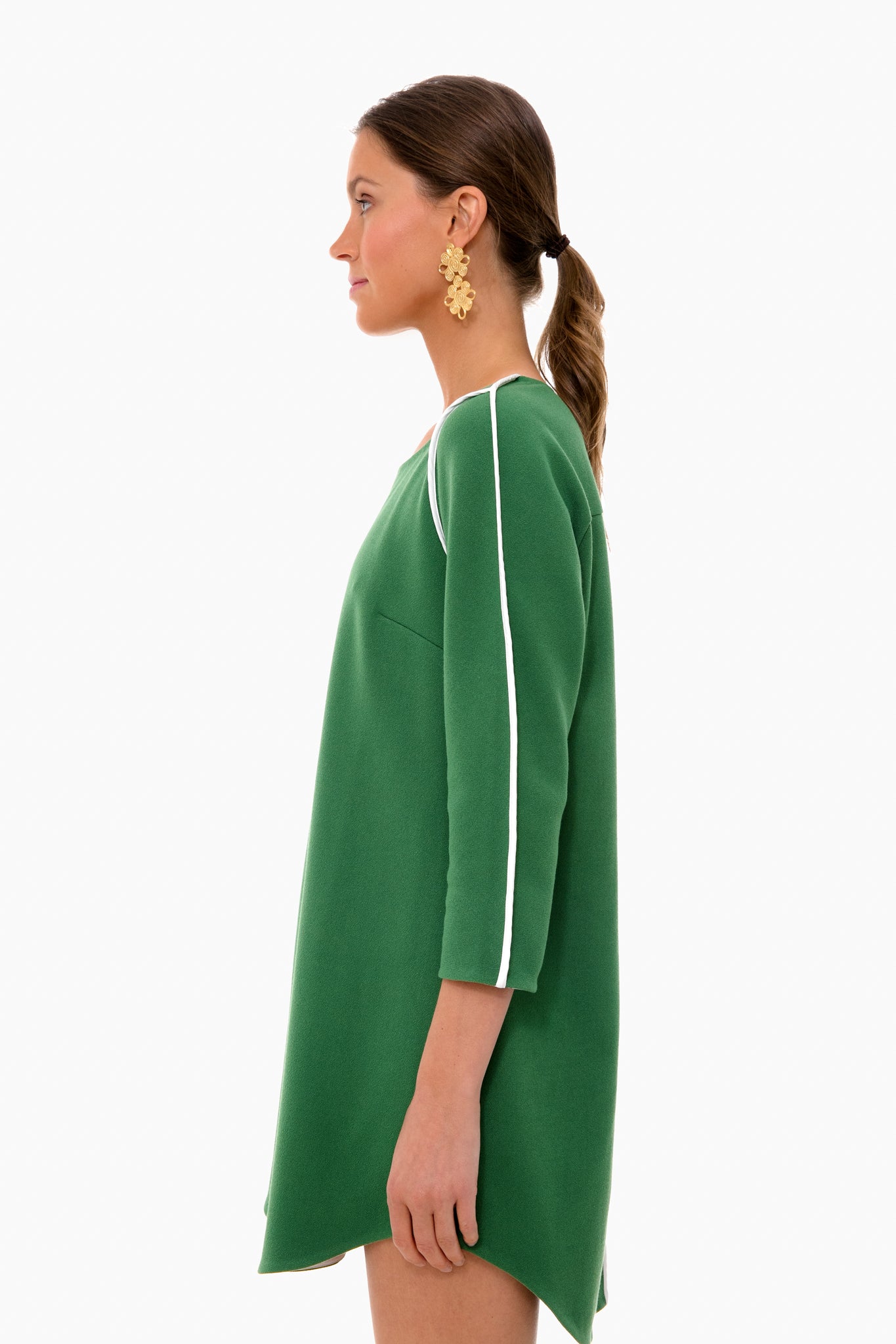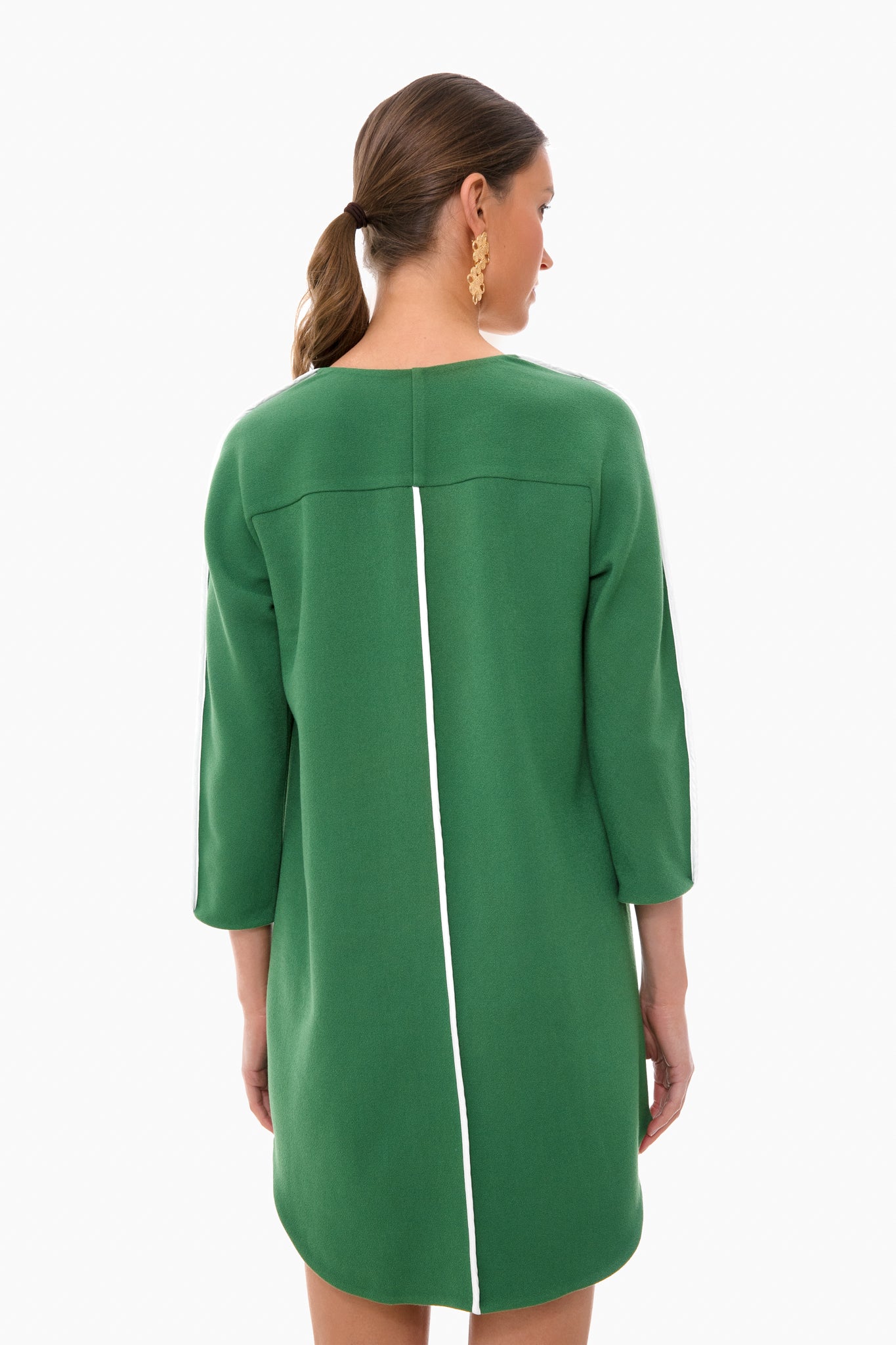 Clean lines. stretch crepe fabric and a shirttail hemline- the Green Seamed Shift Dress slips on in seconds but looks put-together. This dress takes your basic piece and pushes it to new levels with its lively green hue and crisp white piping for a bright and fun play on a staple shift style. We are packing this effortless frock for all of our future trips. as it is the perfect piece to dress up or down with a quick switch of accessories!