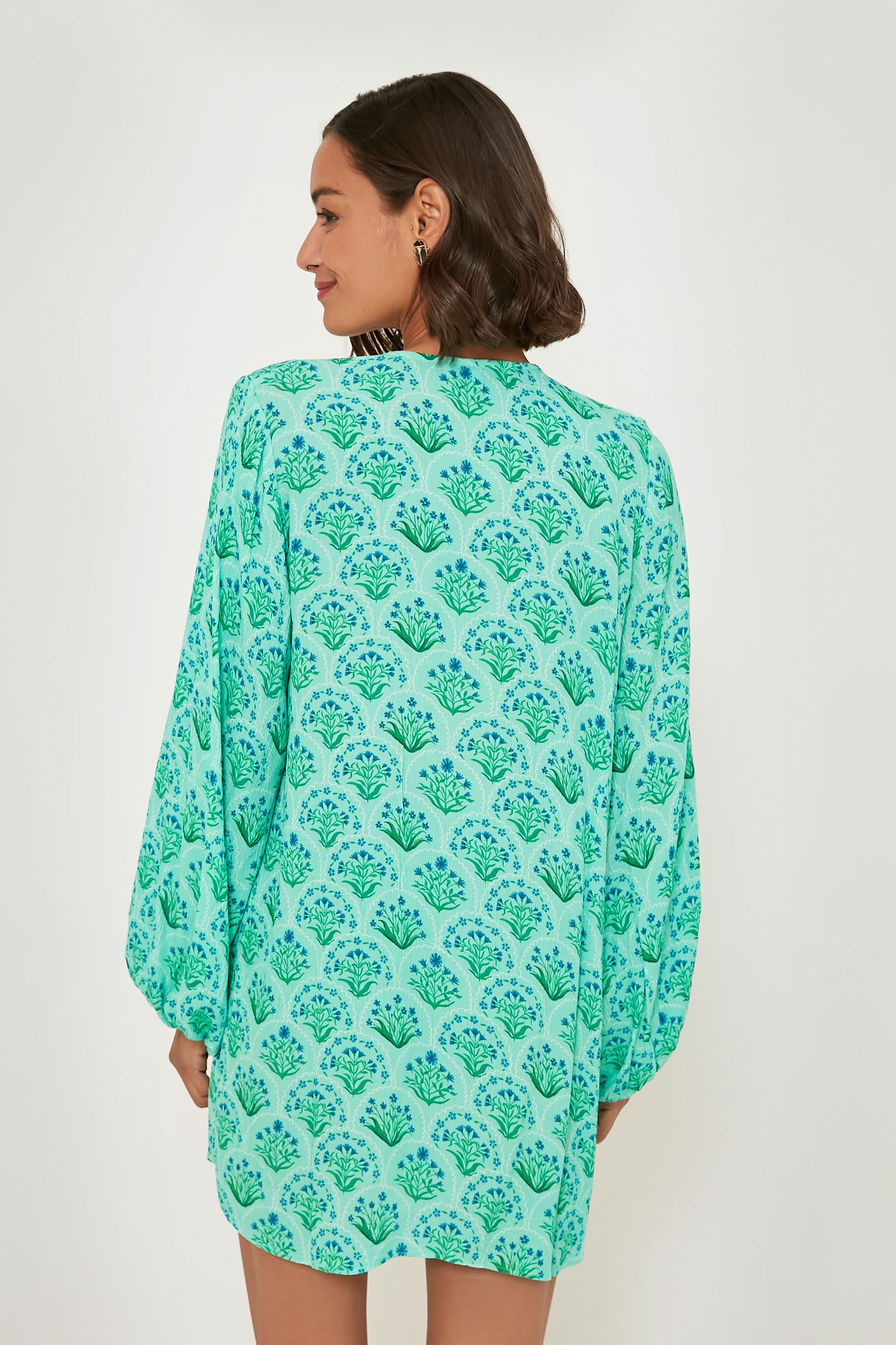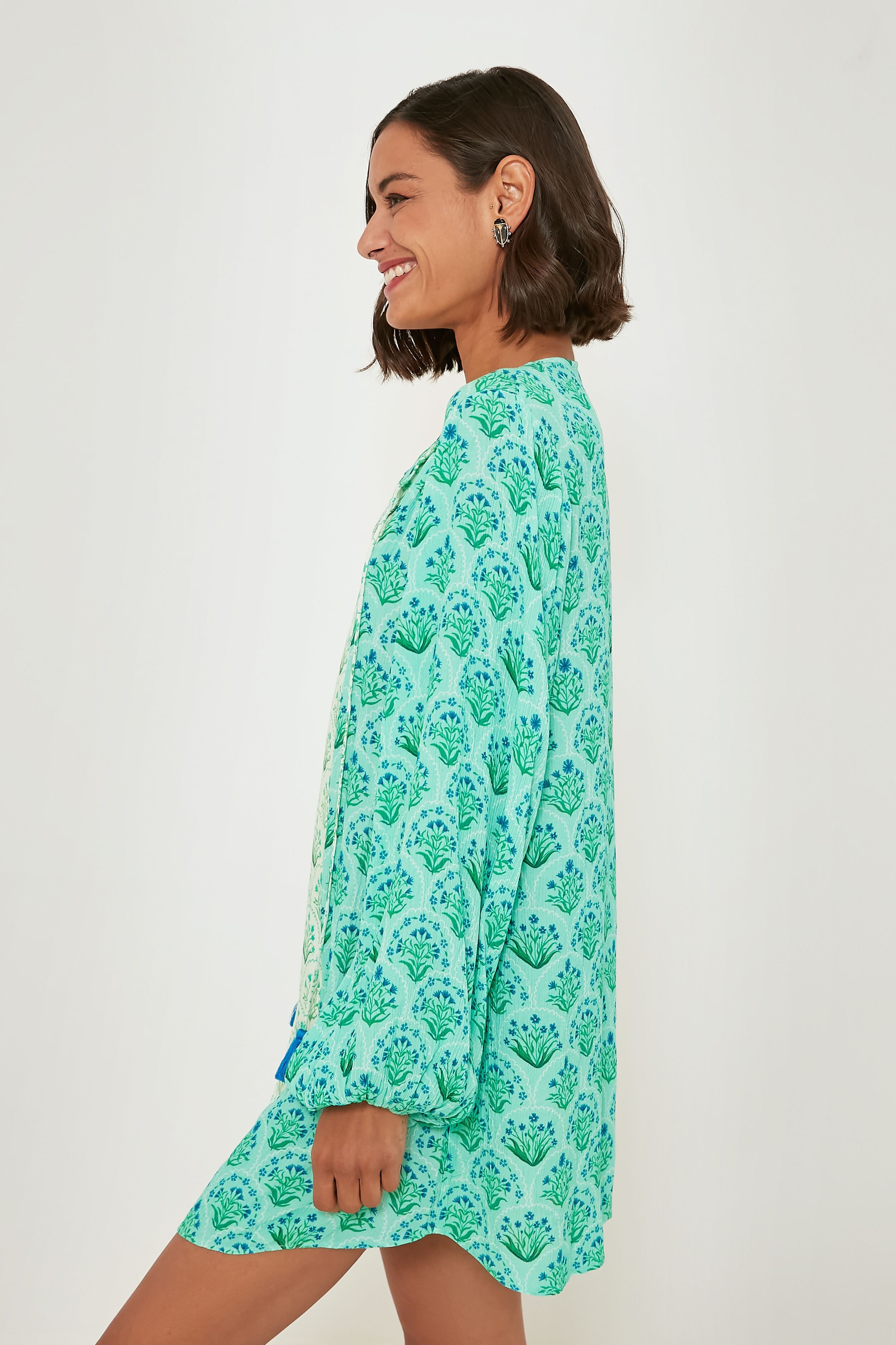 There is nothing more effortlessly chic than a tunic-length caftan. and this seafoam green dress does it oh-so-well. Subtle but stand-out details like a split neckline with tassel ties. long blouson sleeves. and a contrasting stripe down the front all add up to a silhouette you won't be able to turn down. Made from lightweight viscose. this mini is perfect for throwing into your beach bag for days of fun in the sun. or for styling with sandals and gold jewelry for a casual lunch.