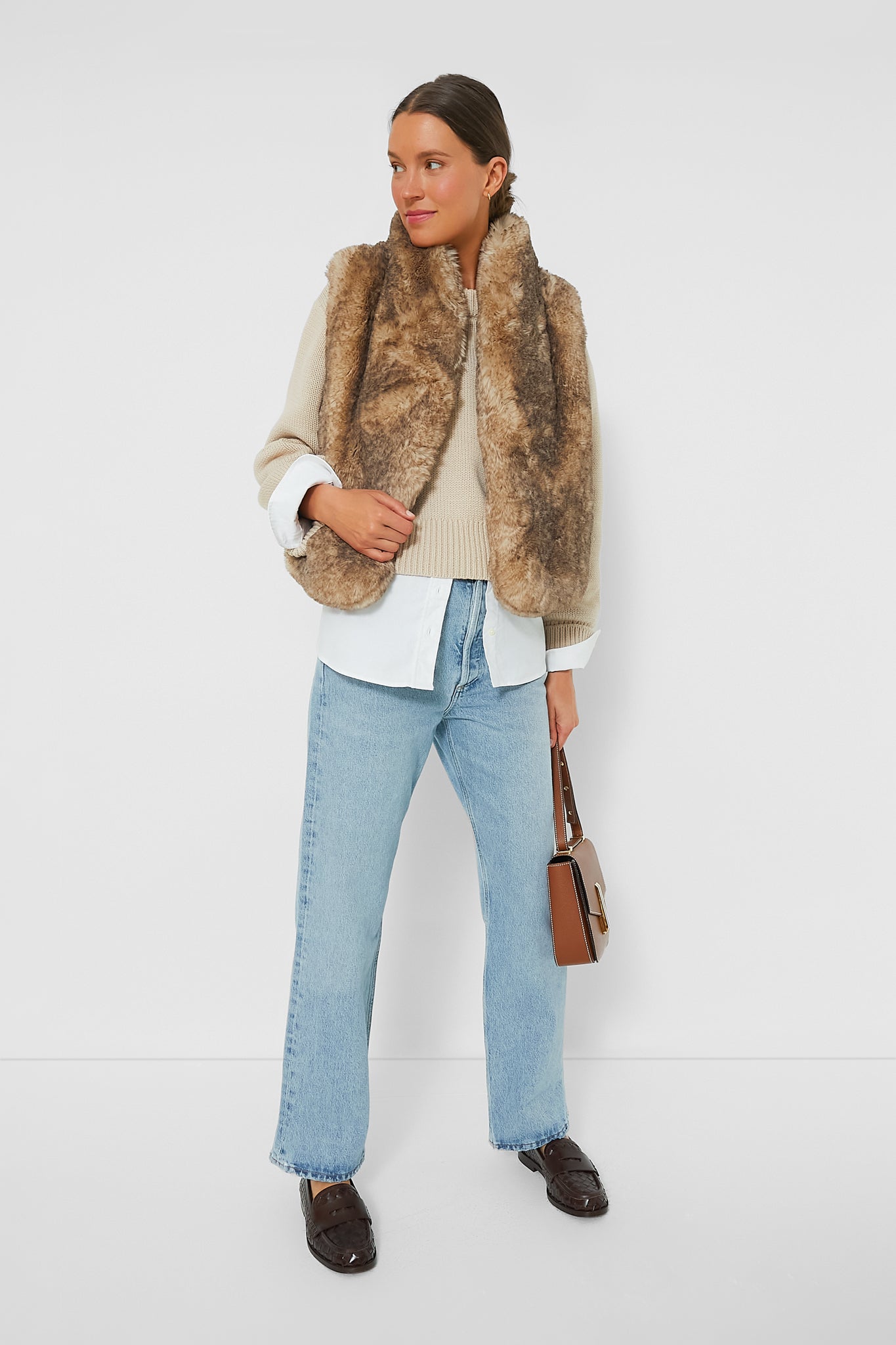 The Greige Marcello Vest is this season's essential layering piece. Cozy and chic - this faux fur style is complete with a stand collar. making it the ultimate outfit topper. Pair this with denim and statement earrings for date night out.