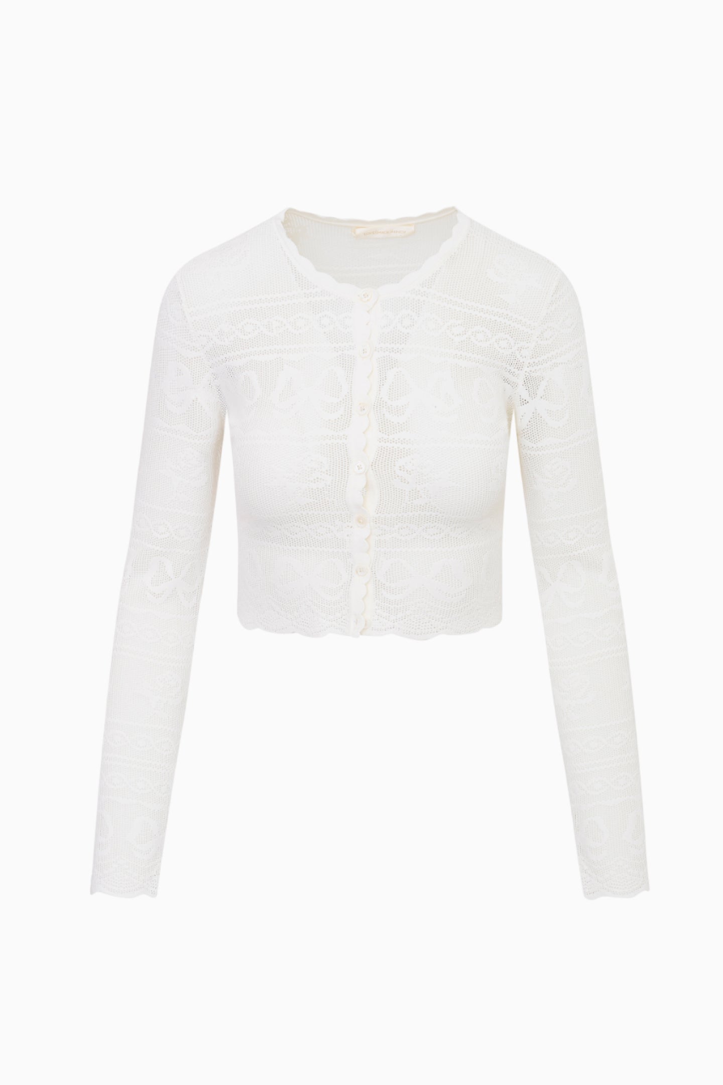 Add a chic layer to your look with the Gretta Cardigan. The charming knit arrives with nice stretch yarn featuring a stunning pointelle jacquard. Patterns of bows and florals are placed throughout the body. With a slim fit. the sweater features a ribbed scallop placket. placed bow and flower motifs. and our custom faux shell buttons.
