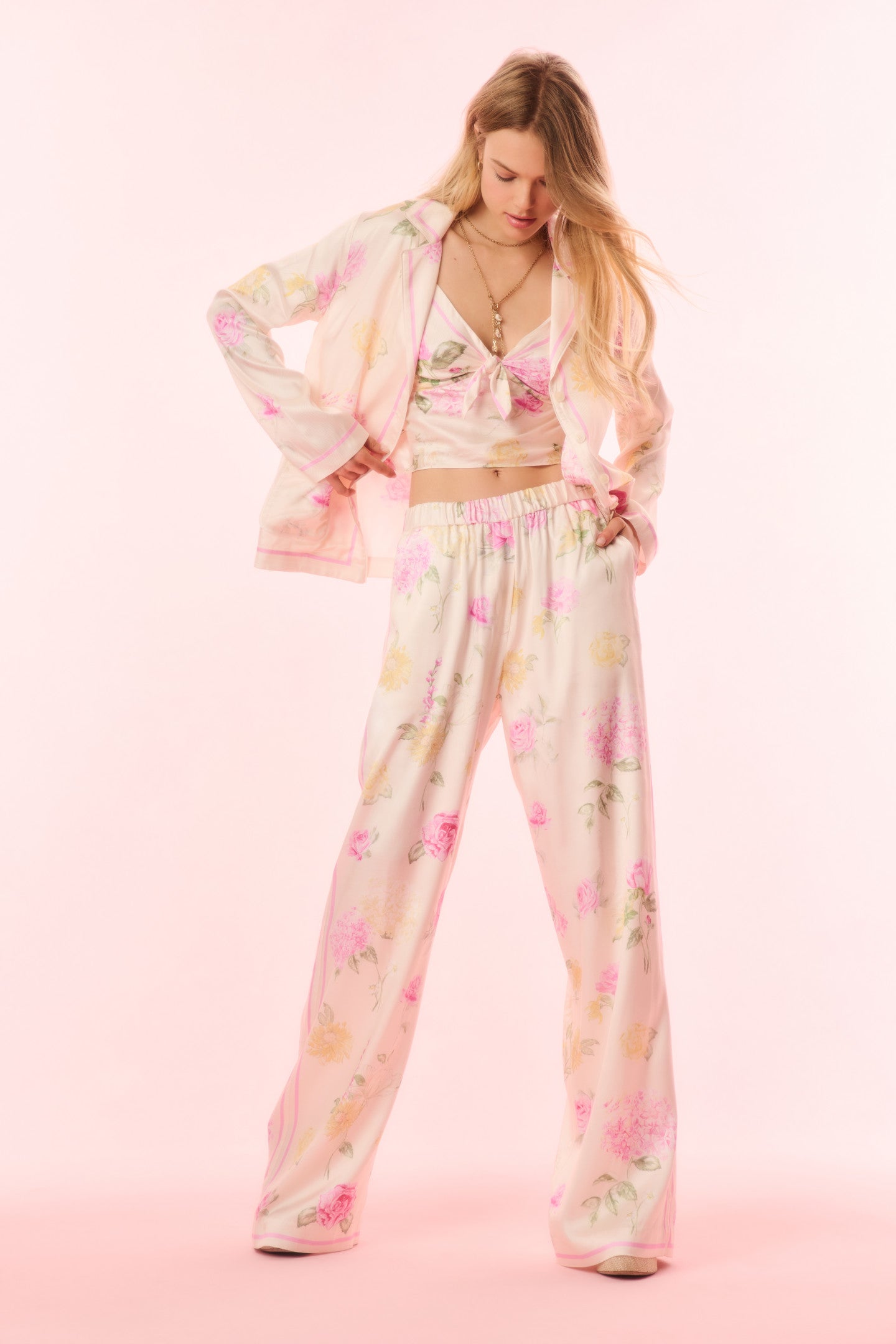 Introducing the Helia Pant. These elevated pajama pants feature an Italian-inspired print with hand-painted flowers in a romantic arrangement and stripes down the sides. With a flowy wide leg. these bottoms have an elasticated waist for easy pull on. back welt pockets. and side pockets. Pair with the Renetta Top for the full set.