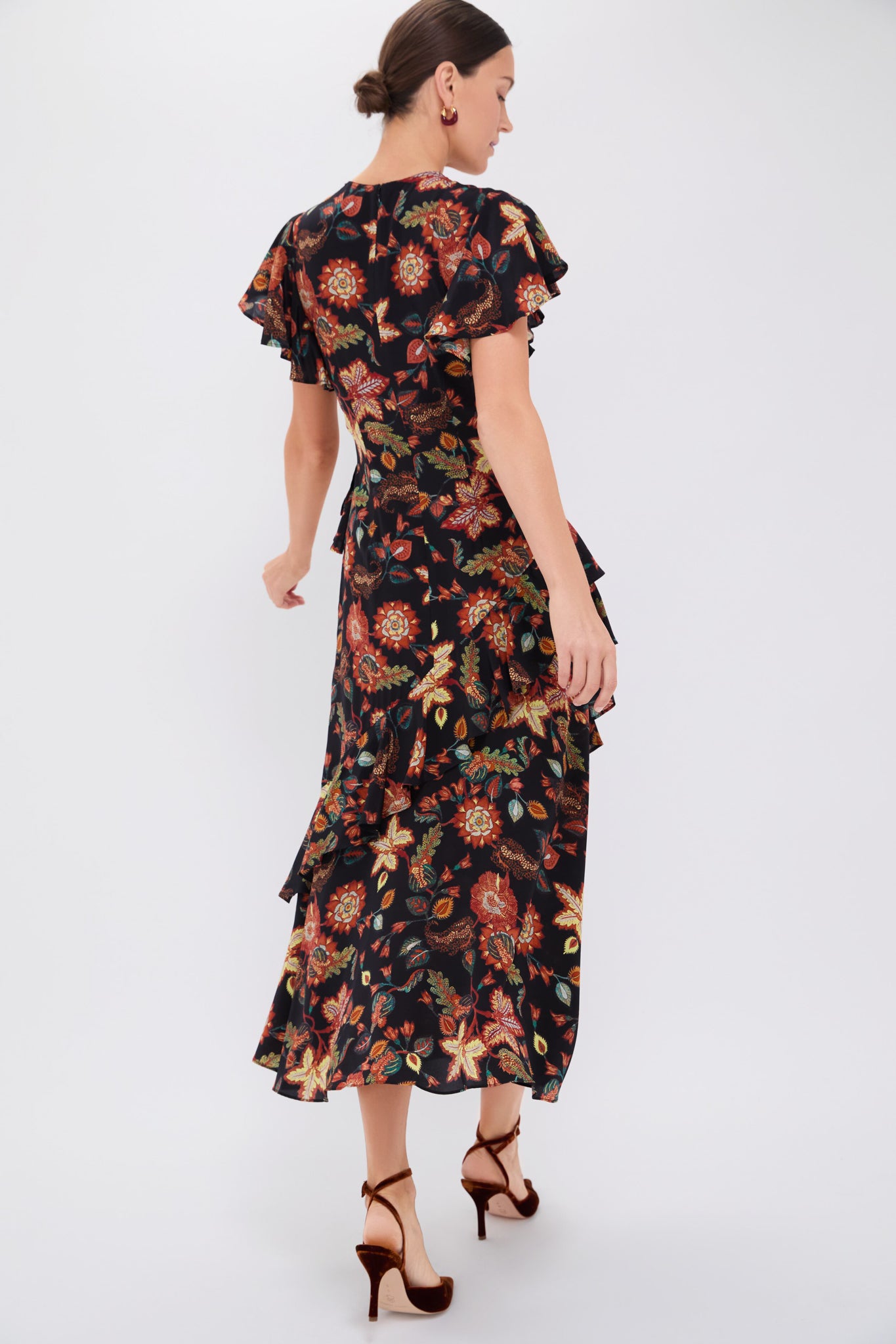 The Amaia Dress is richly patterned with florals rendered from a custom. hand-painted artwork created by a master textile artisan in India. The eye-catching print is accompanied by a feminine silhouette with ruffle tiers and flutter sleeves. Pair with boots or heels for a season-less look that is sure to gain compliments.