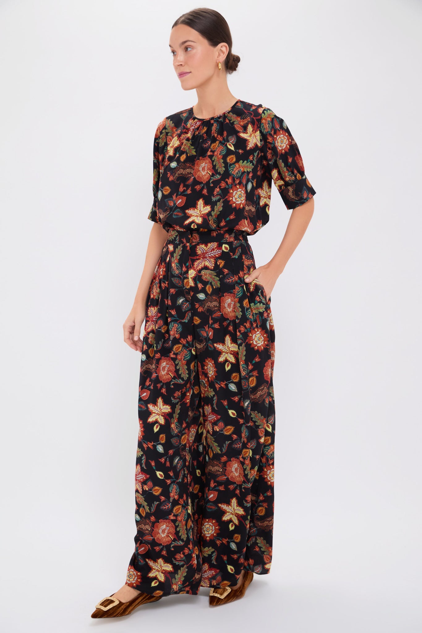 The Linnea Pant is adorned with a mesmerizing floral print rendered from a custom. hand-painted artwork created by a master textile artisan in India. The eye-catching print is accompanied by a high waist with a fluid silhouette defined by pleating and flows to a wide leg. Pair with heels and the matching Hellebore Mirelle Top for a striking ensemble.