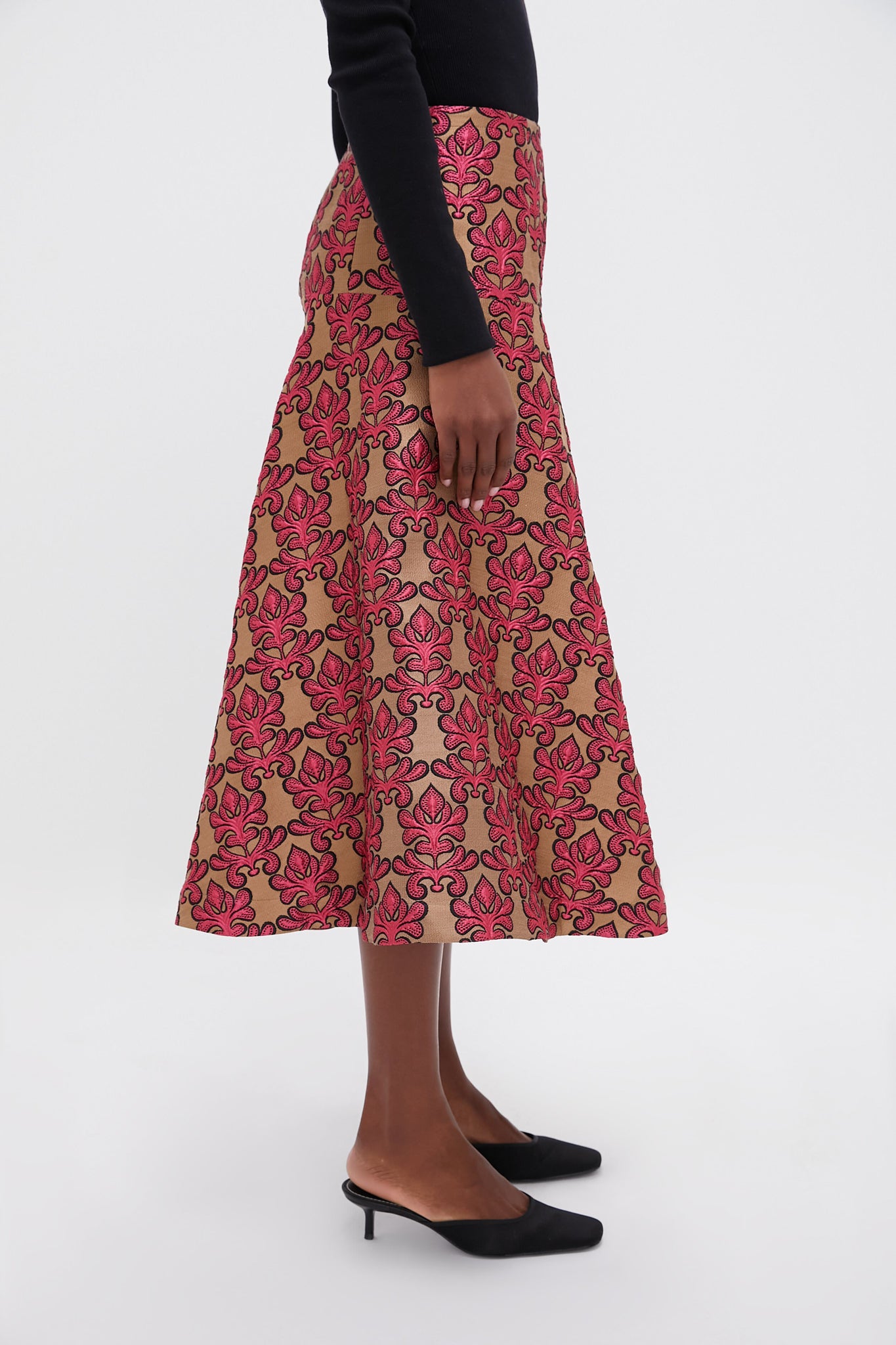 The Herald Jacquard Janis Skirt exudes elegance with its ornate pattern and fitted waist that flares into a full A-line silhouette. We are styling ours with heels and a fitted top for a look that screams sophistication.