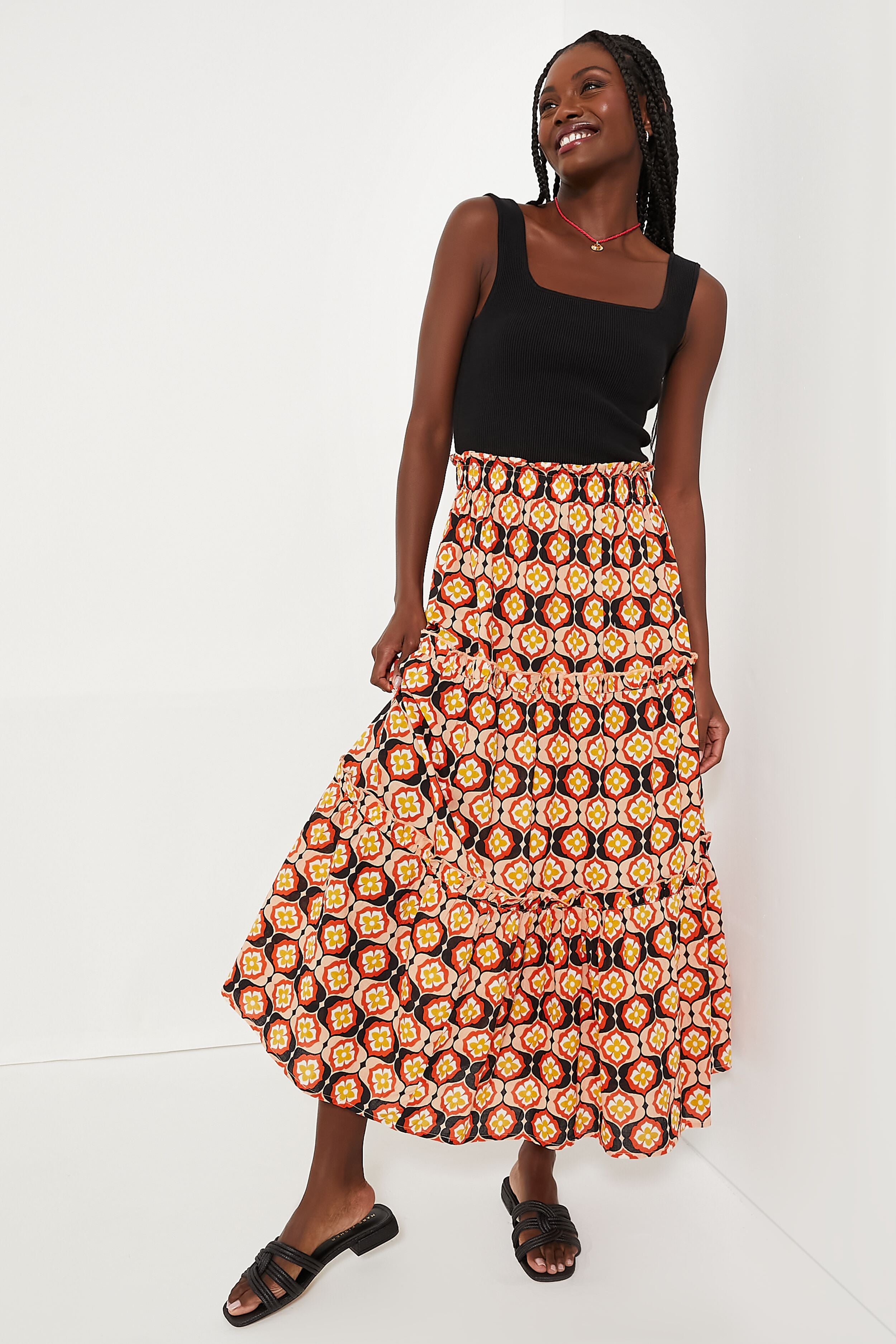 We simply can't get enough of the retro-inspired Honeycomb Bloom Prado Skirt! This best-selling silhouette features an elastic waistband. ruffle tiers. and an easy unlined body. The bold pattern is playful and makes a statement in the warm-weather months. Pair with a bathing suit and sun hat for heading to the beach. or with a tank and sandals for grabbing drinks!
