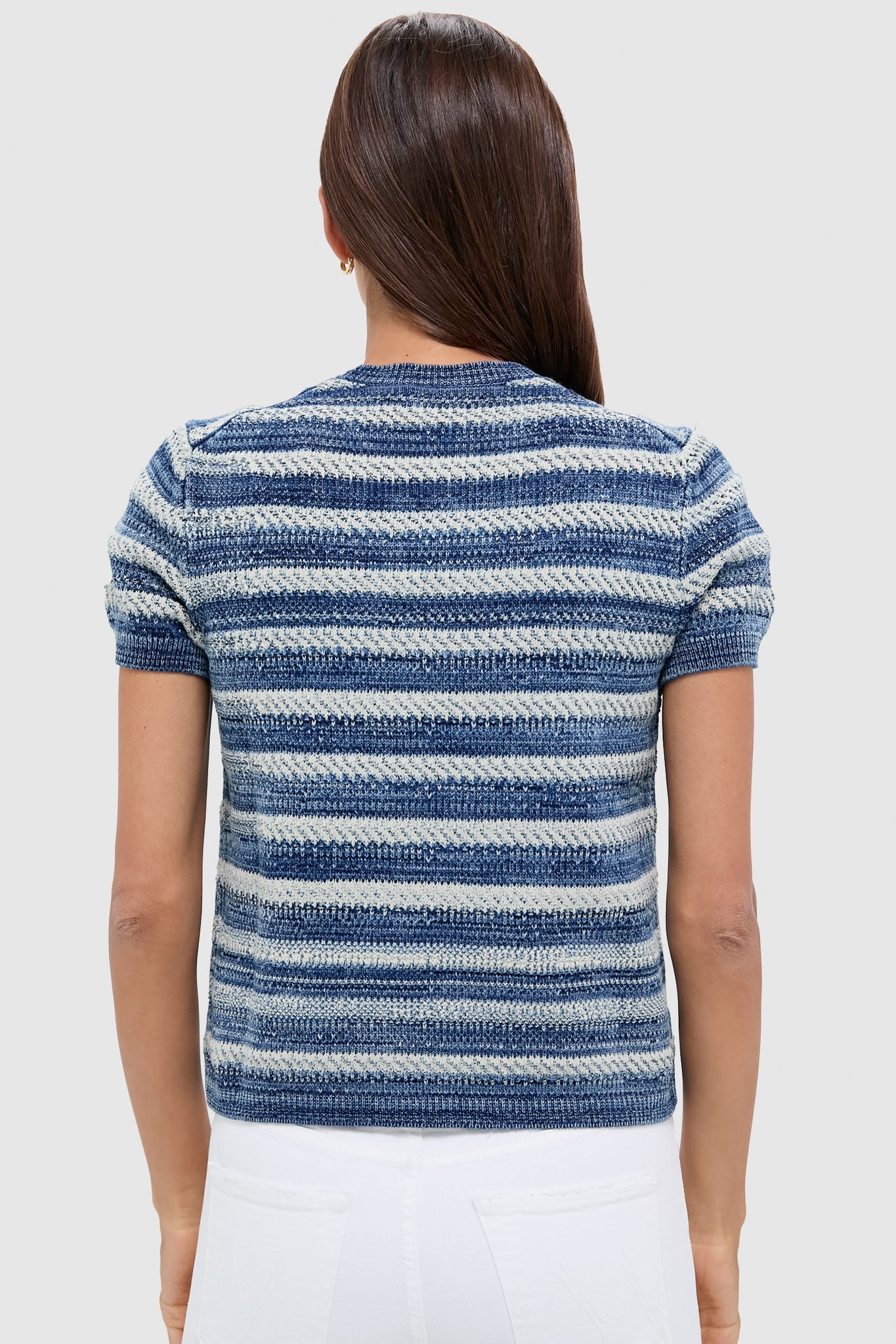 Elevate your wardrobe with the Indigo and Ecru Short Sleeve Pullover Sweater. featuring an uneven stripes in an array of textural stitches. Knit with cotton. pair this crew neck pairs perfectly with denim. skirt. or shorts! Just add flats and a crossbody bag for an elevated. everyday look!