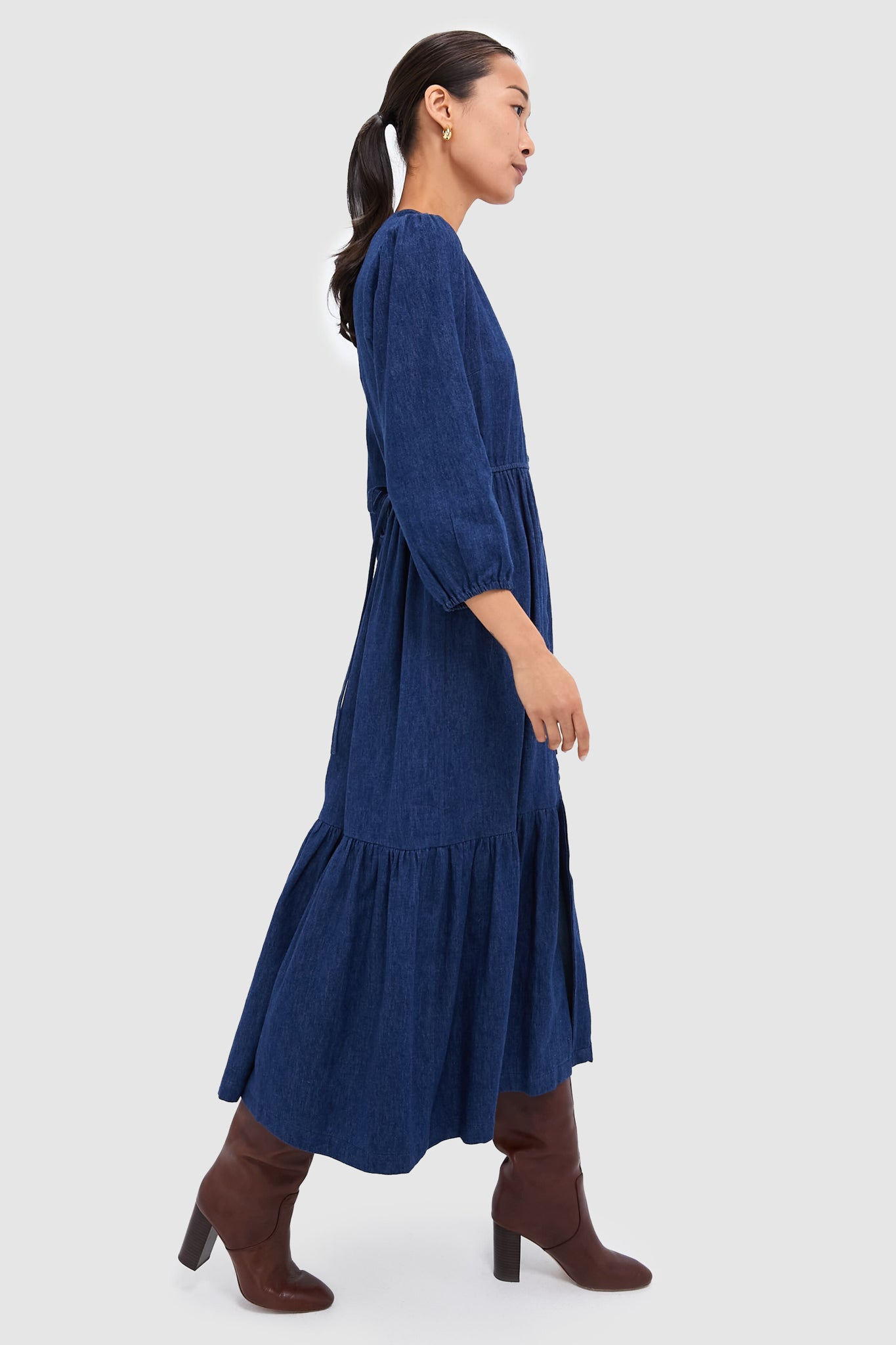 This tiered maxi is a true closet staple. boasting a fitted waist. button front. and three-quarter length puffed sleeves. Perfect for transitioning from day to night. we are pairing it with everything from ballet flats. to boots. to heels!