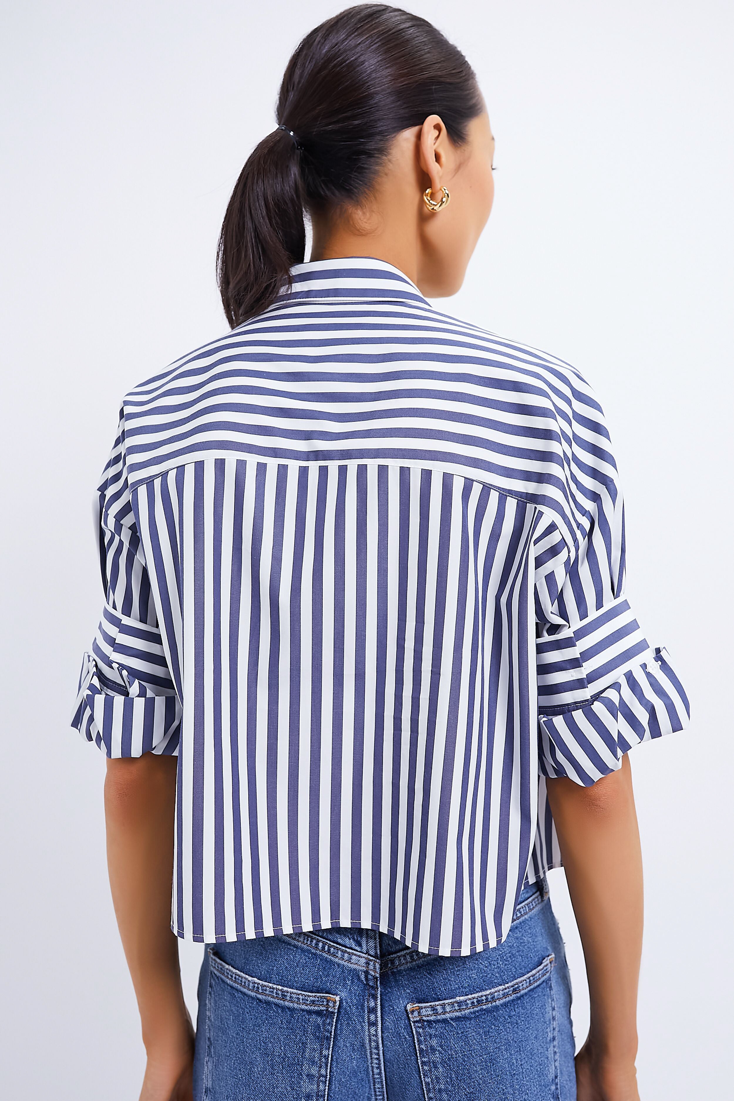 Exude cool-girl energy in the Indigo Off White Stripe Next Ex Shirt. This button-down top is a cropped. boxy silhouette complete with a chest patch pocket. spread collar. and TWP's signature double roll button cuffs. Pair with denims and sneakers for a step up from casual. or with a maxi skirt and sandals!