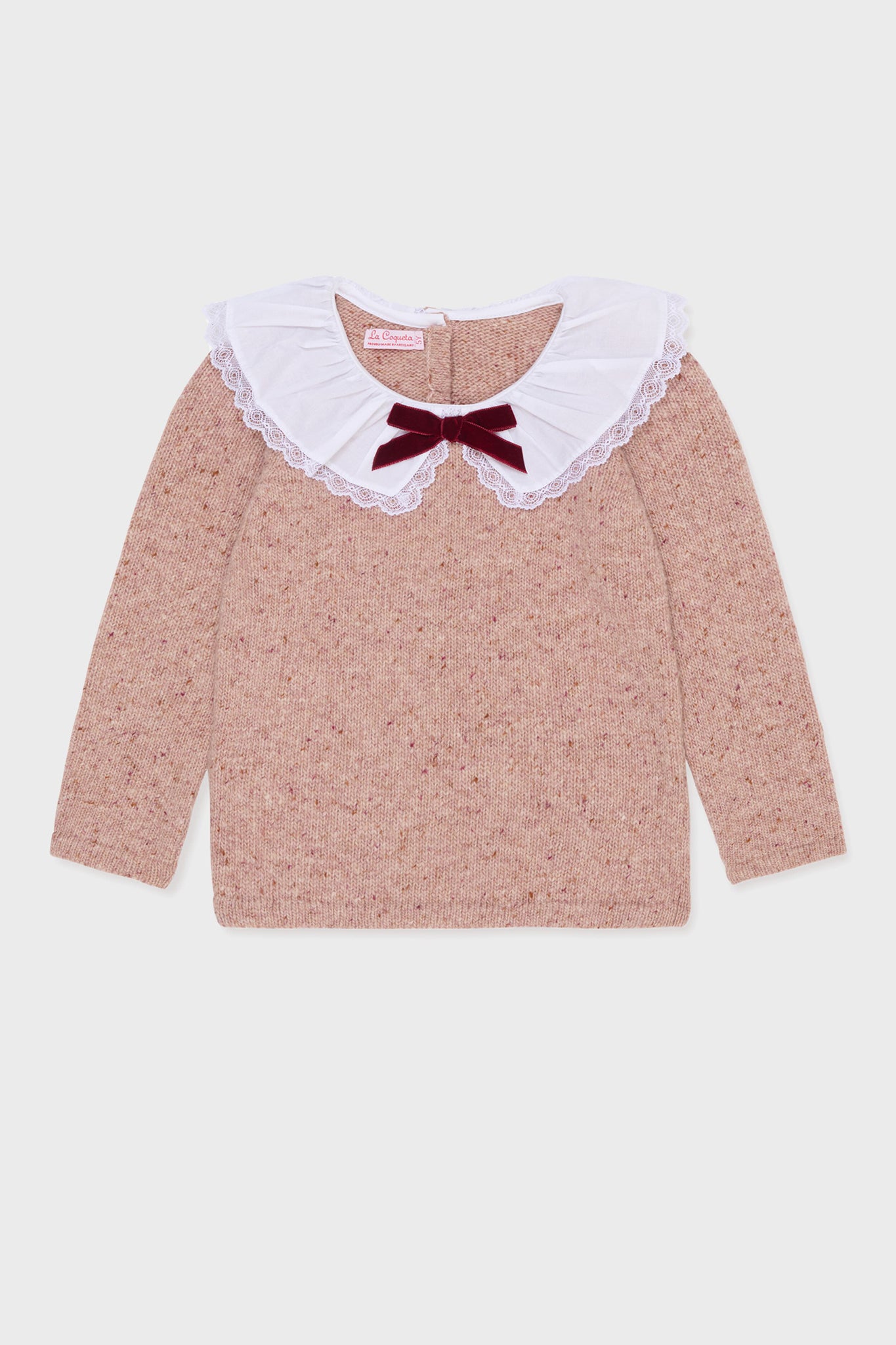 Crafted from a softest merino-wool blend. and decorated with an oversized collar with french lace and cute velvet bow. this Isla Jumper has a relaxed. boxy shape. with dropped shoulders and knitted long sleeves that drape perfectly on the arms. Rendered in a dreamy shade of dusty pink. it is perfect for family get-togethers and after school activities.