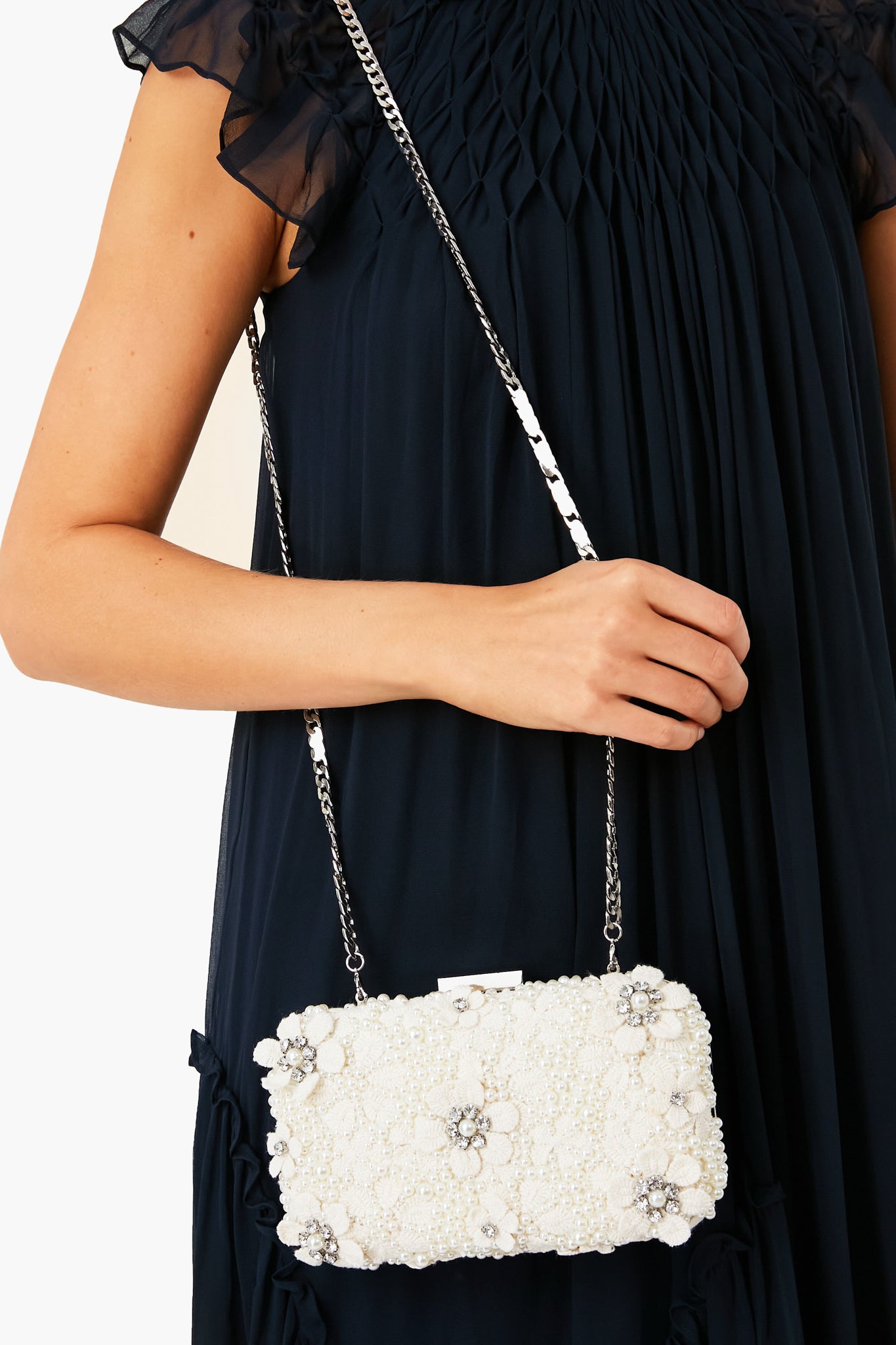 The Ivory Beth Clutch is an intricately decorated bag with a luxe look and feel. This stunner features a textural exterior consisting of tiny. three-dimensional crocheted flowers trimmed with silver crystals. Perfect for a modern bride or for any formal occasion coming up on your calendar. this detailed number just needs a fabulous dress to go with!