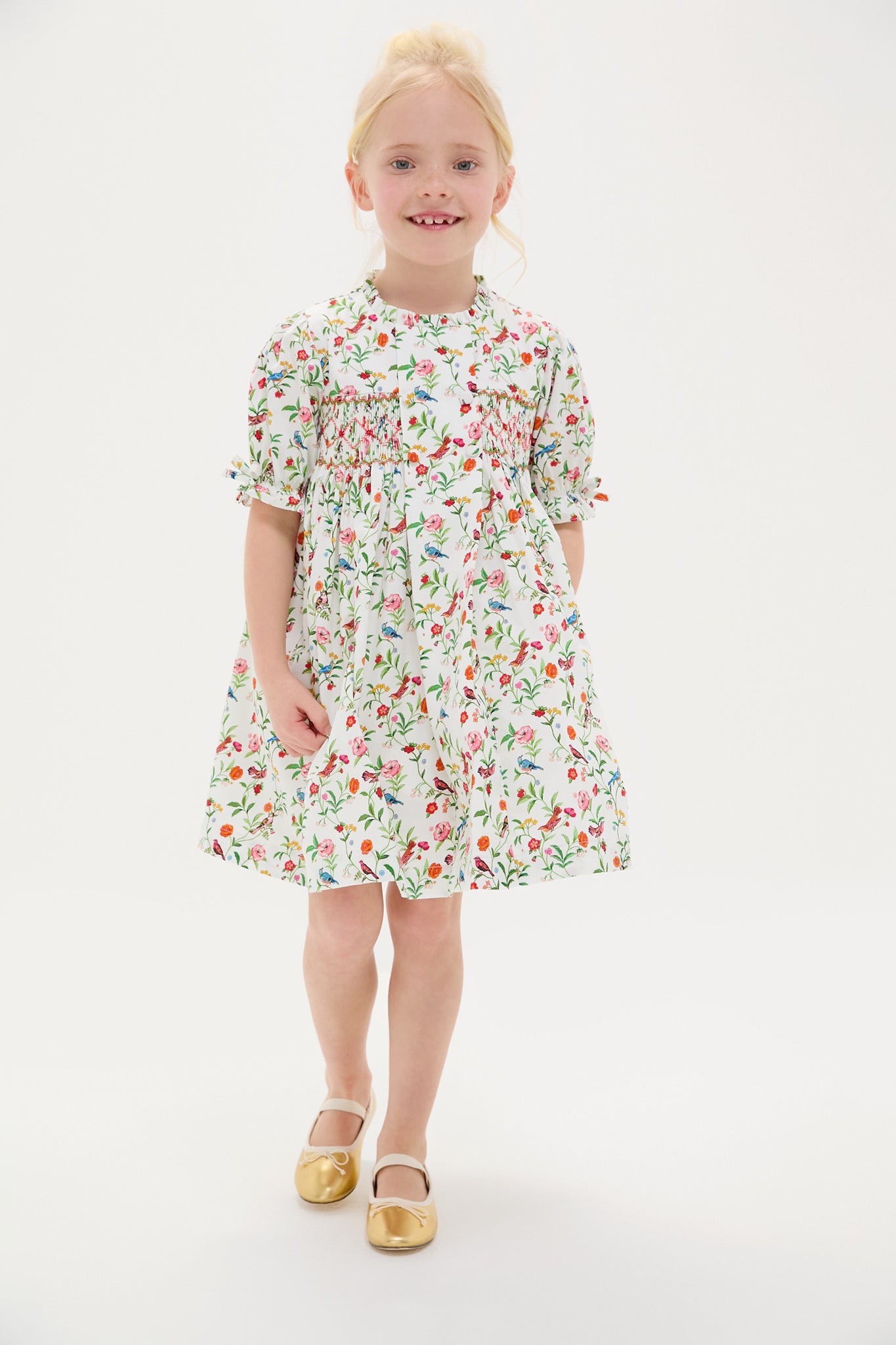 The Ivory Bird Floral Carla Hand-Smocked Girls Dress is a delightful choice for the warm-weather season. With a charming stand collar. pleated trim. and shirred bodice. this dress exudes total elegance. Short puffed sleeves add a voluminous touch. while the longer-length floaty skirt is fully lined for comfort and finished with a self-tie bow at the back. From school events. family functions. and everything in between. this is a dress your little one is sure to love!
