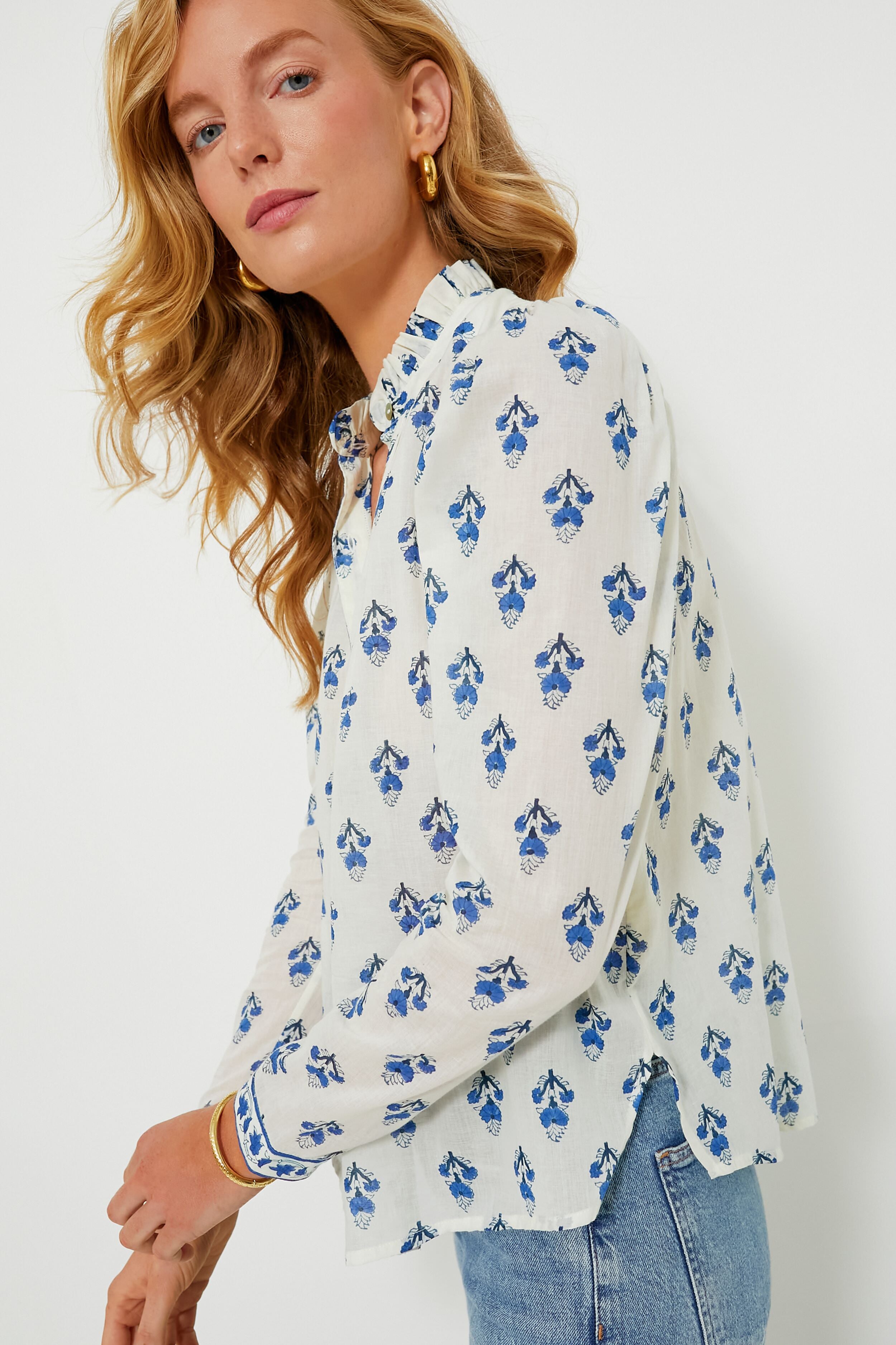 Channel your inner boho-chic cool-girl in the Ivory Indigo Artemis Bhutti Shirt. a staple in any season. Finishing touches include a ruffle details on stand collar. mother of pearl buttons down the placket. and a floaty fit that all come together to create an understated but elegant top. Made of lightweight and breathable cotton. this style is beautifully paired with trousers for an elevated ensemble or tried-and-true denim for a retro-inspired boho-chic look.