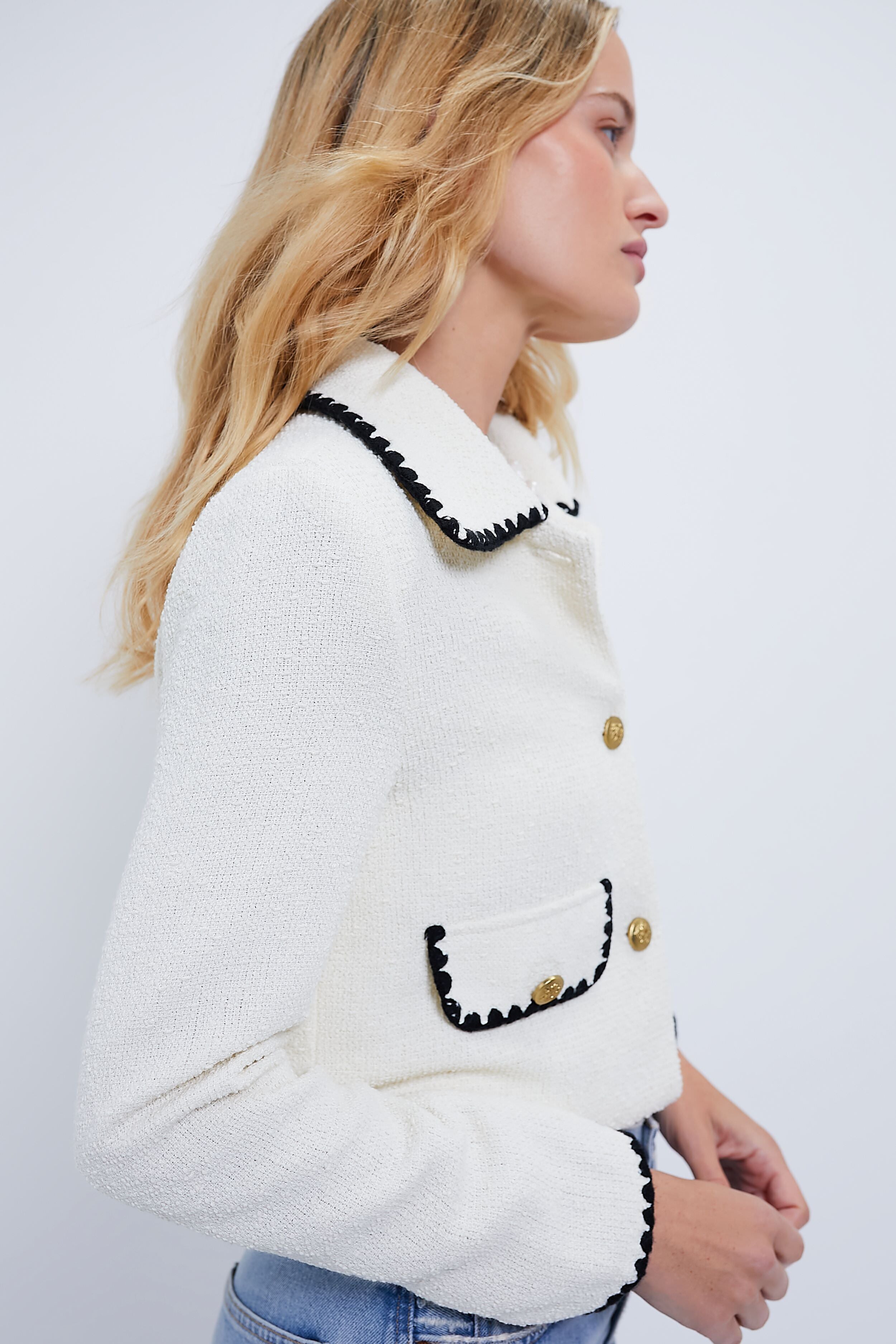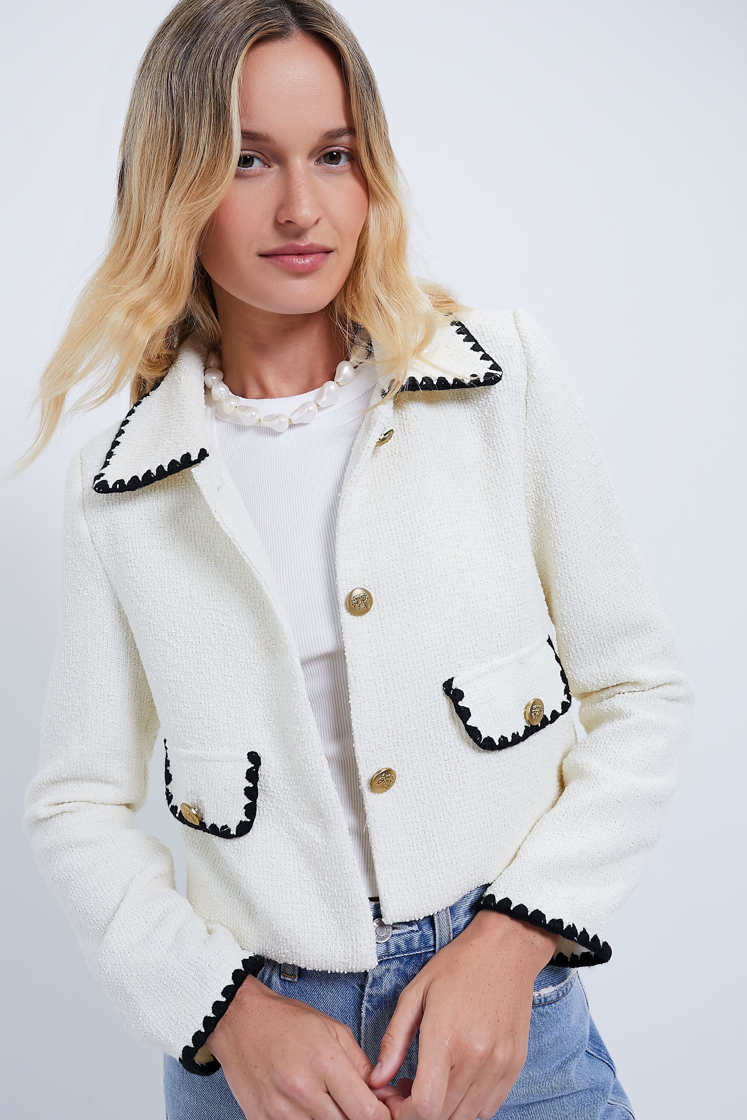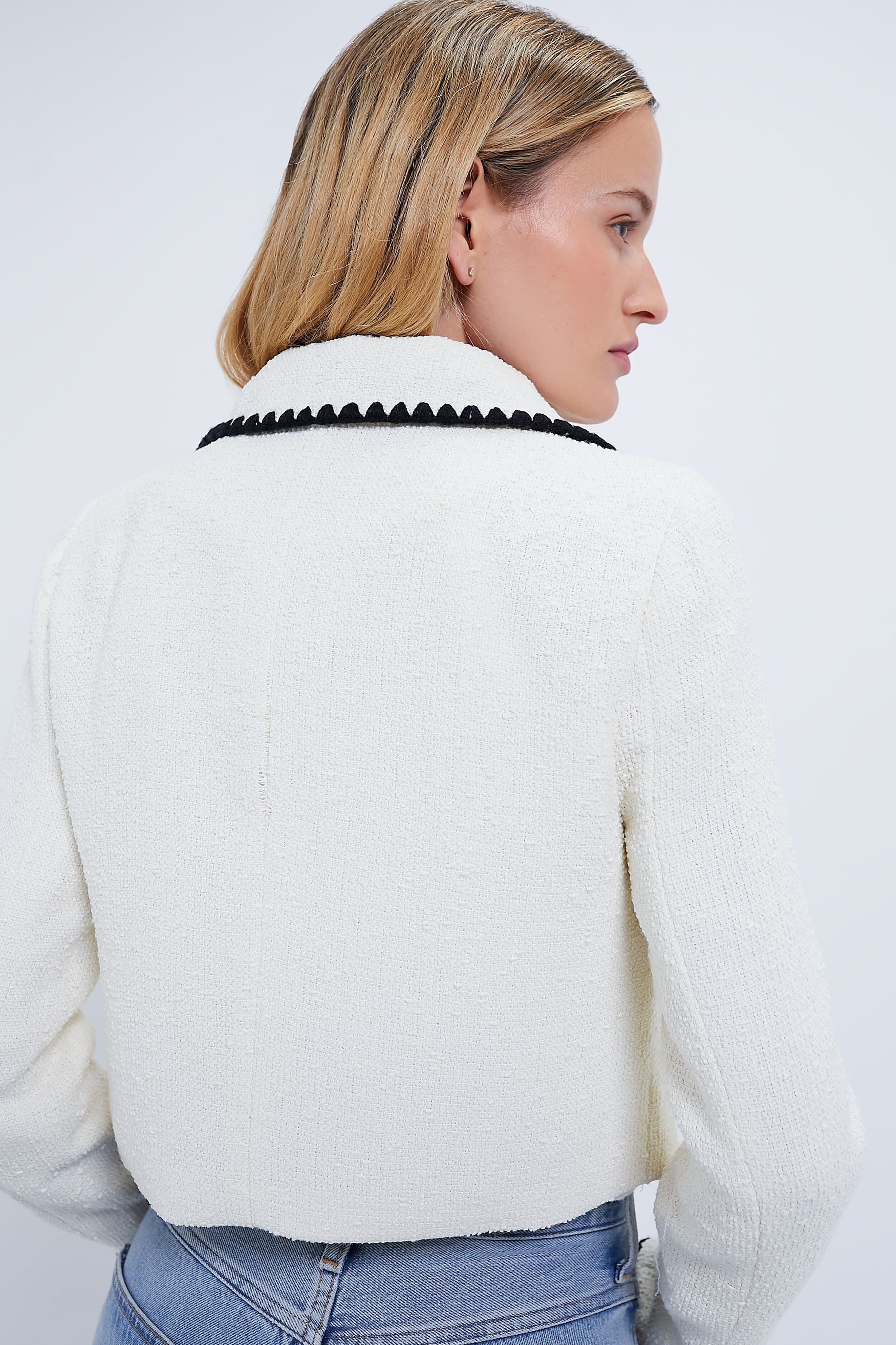 Lovely and ladylike. the Ivory Jacket is effortlessly elegant. A luxe neutral colorway combined with contrast stitch details. this slightly cropped blazer is perfect for wearing anywhere for a chic boost. Pair with denim and flats for a polished yet casual look. or throw it on over a dress for a feminine moment.