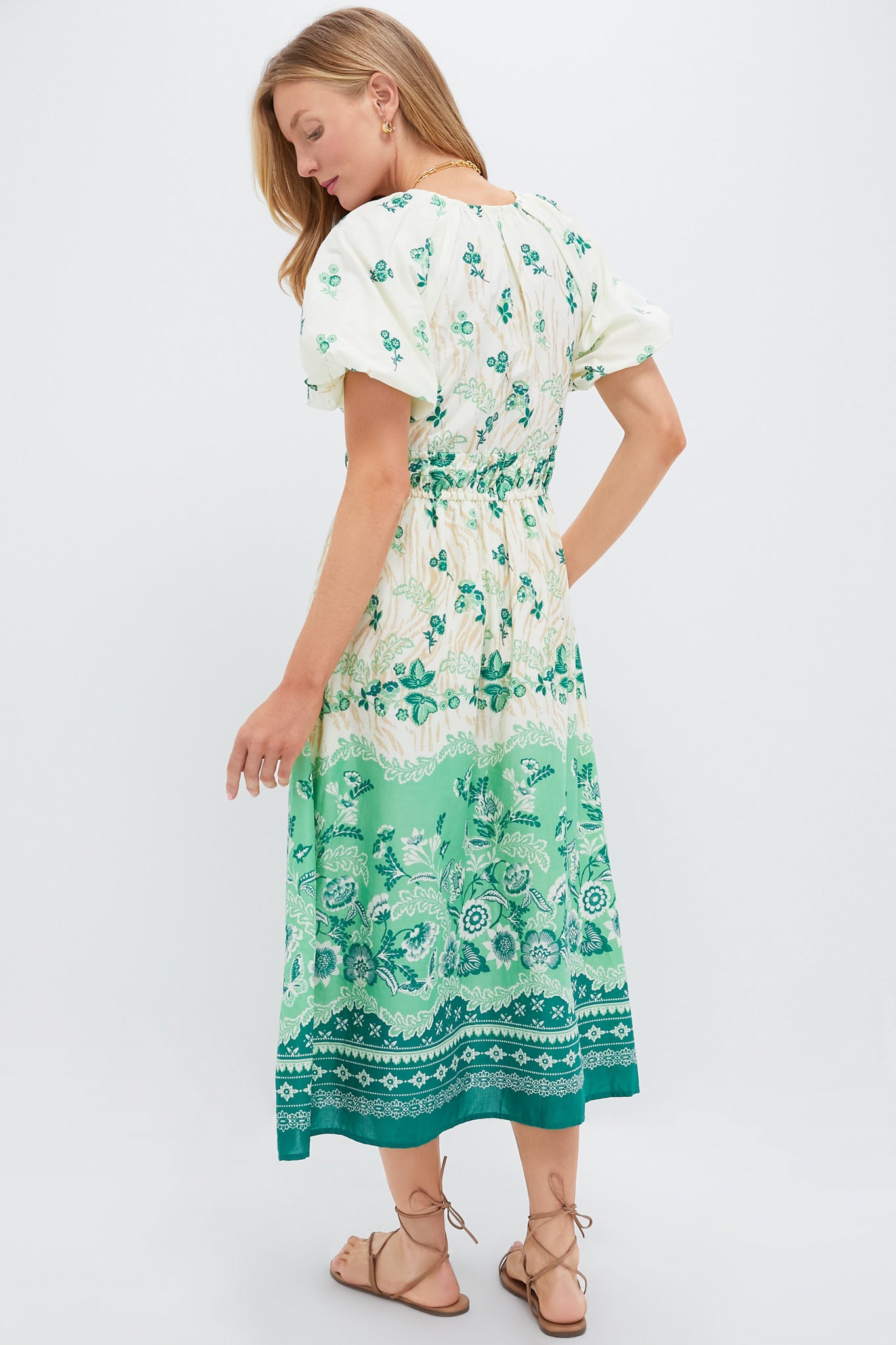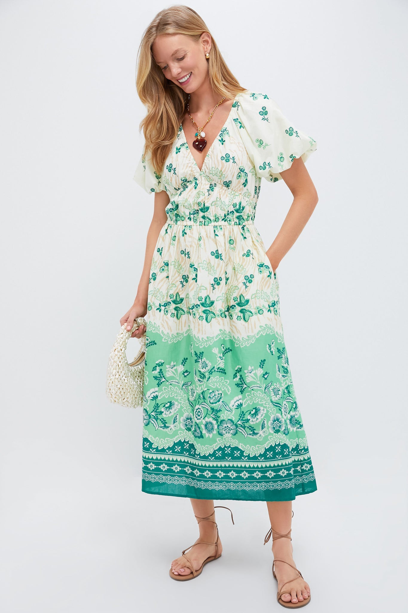 The Francesca dress is an effortless look that takes you from pool-side fun to evening cocktails. In our cool cotton fabric and wanderlust print. a flattering V-neck is framed by puffed sleeves and delicate seaming. Featuring soft elastic under the bust and waist. the Francesca is an easy. pull on style that's fully lined and finished with side seam pockets. Pair with platform espadrilles and statement earrings for a chic look!