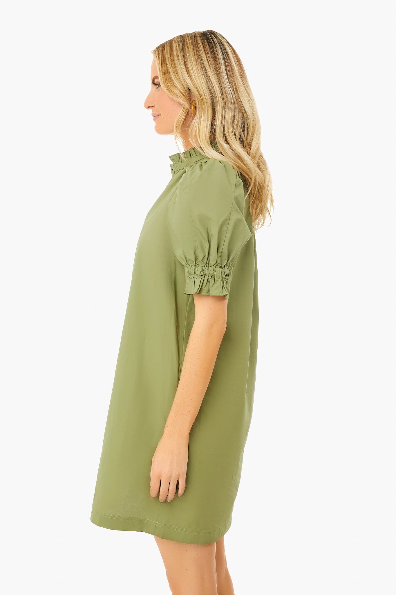 Featuring a puff shoulder detailing and a ruffled collar. the Sabina Dress is a simple statement piece thatâs necessary in every wardrobe. Snap buttons accent this relaxed. popover silhouette. Pair with sandals and gold jewelry for an effortlessly chic look.