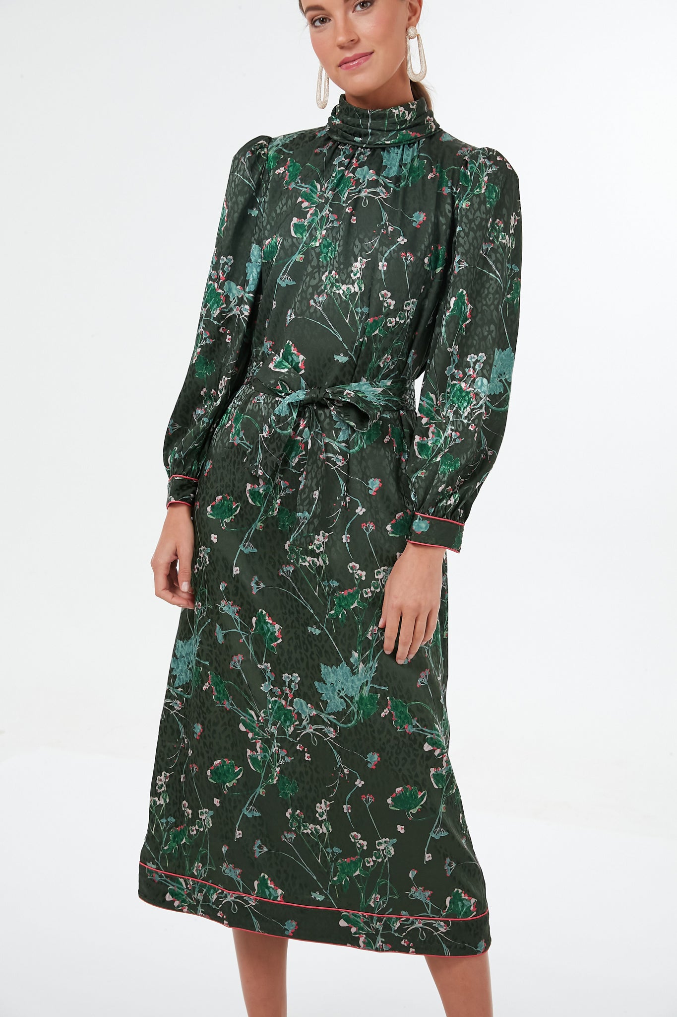 Timeless elegance with a twist is instantly achieved with the Jaguar Garden Faven Dress. A subtle leopard print is overlaid with watercolor inspired floral motifs and contrasted with a punchy pink trim on the sleeve cuffs and hem for a bold look to take on the season. Adorned with compliment worthy feminine details like slightly puffed sleeves. a removable waist sash. and a back slit. this midi is sure to be a showstopper in all the best ways. Style this glamorous stunner with gold heels and a statement clutch for a glitzy night of dancing and laughs.