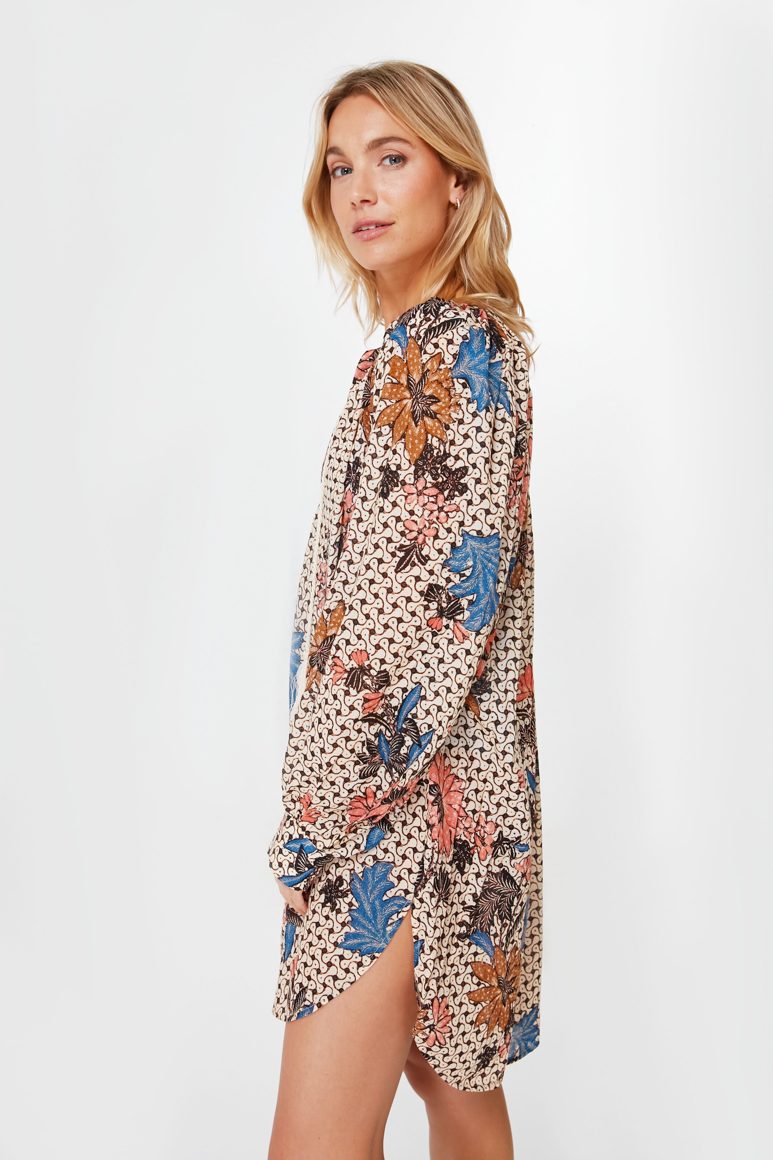 Adorned with funky. geometric florals. the Jasmine Biarrtiz Tunic is the perfect "I'm on vacation. do not disturb" look. Cut from an airy and light cotton blend. this breezy number features voluminous sleeves and tassel ties that are full of beachy bohemian charm. Wear from sunrise to sunset. beach to bar. with sunglasses or sandals—trust us. this silhouette can do it all.