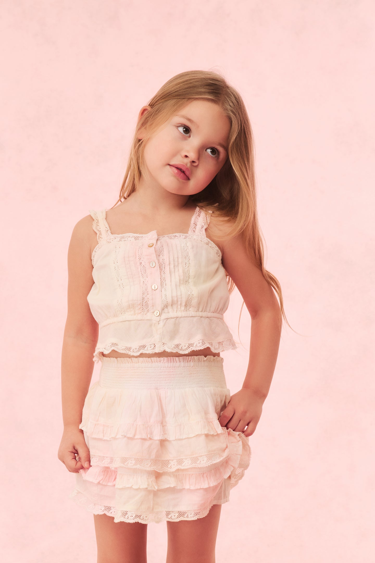Our minis are ready for sunshine in the Jessamine Top. This piece features a vibrant. tie-dye on an airy. cotton fabric. The piece features tank straps that fall to a bodice with vintage-inspired lace insets. buttons at center front. and a playful ruffle hem.