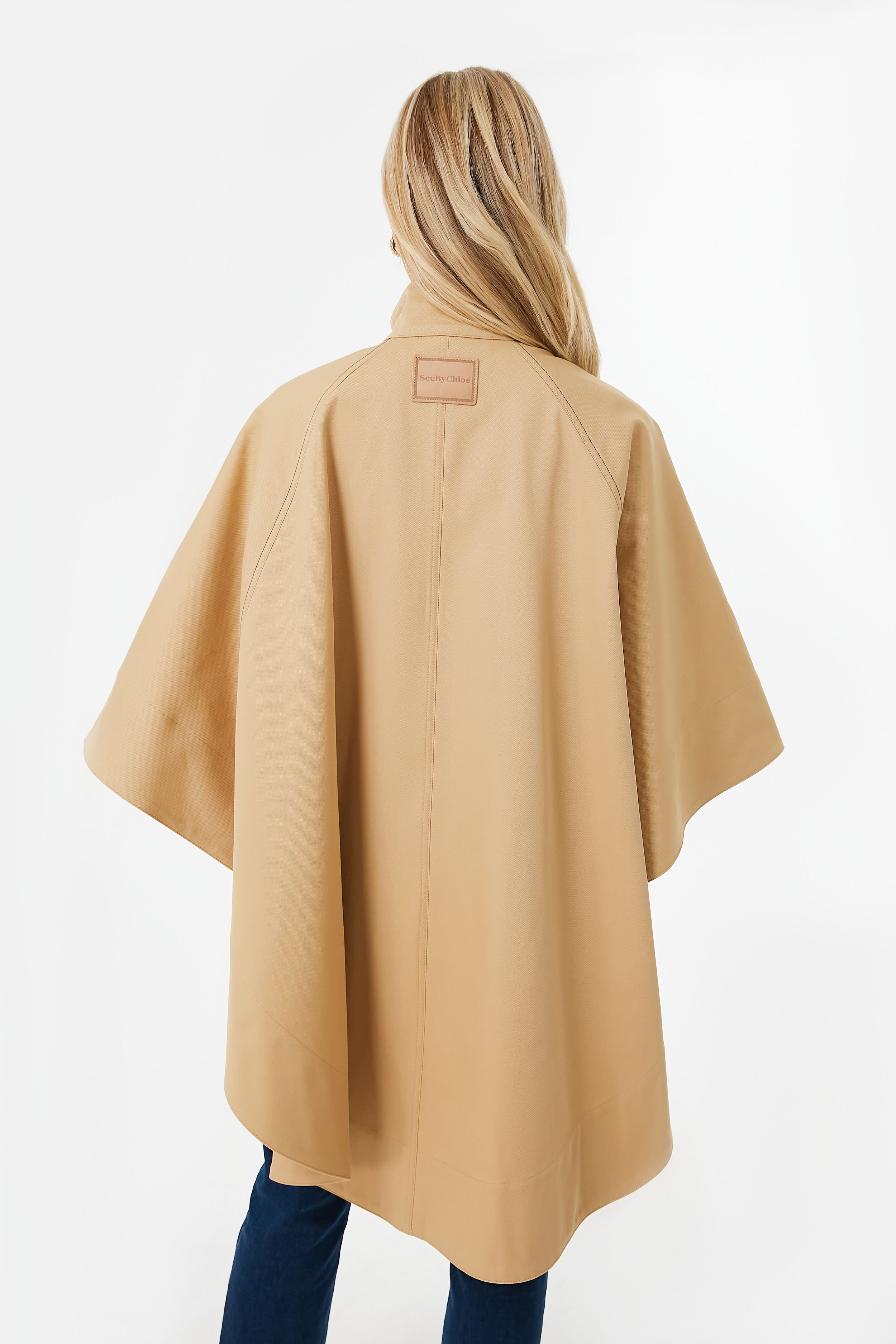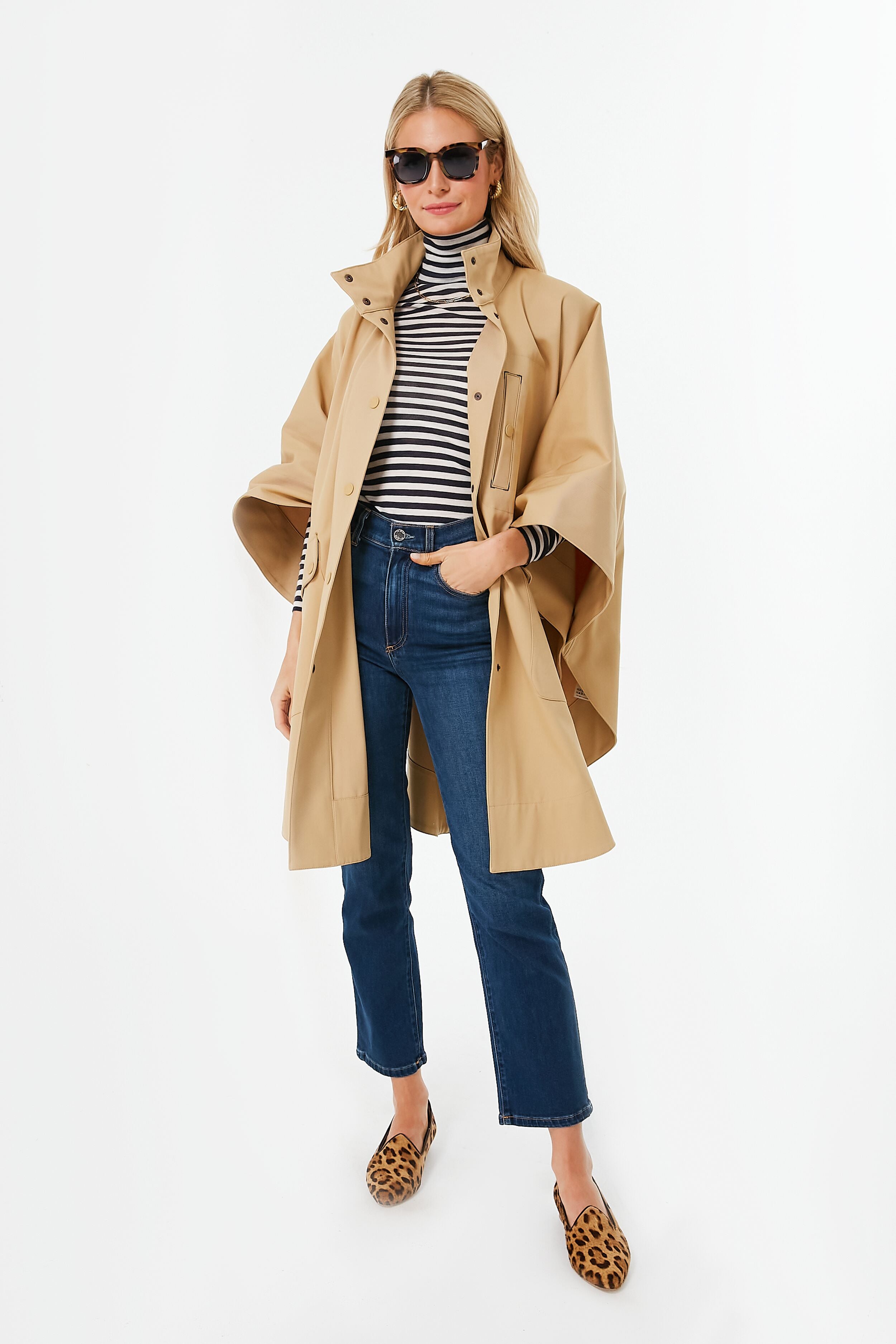 A trans-seasonal staple. the Jungle Brown Cape seamlessly blends utilitarian functionality with elegant beauty. A stand collar. snap front placket. and knee-length hem ensure you are able to keep the nasty weather out. while flared poncho sleeves and a luxe gabardine fabric bring stylish elements that are sure to have you looking chic and sophisticated on even the grayest of days. Pair with denim. boots. and a silk scarf for an elevated yet classic look. or wear with a chunky knit underneath to stay extra warm while looking cool.