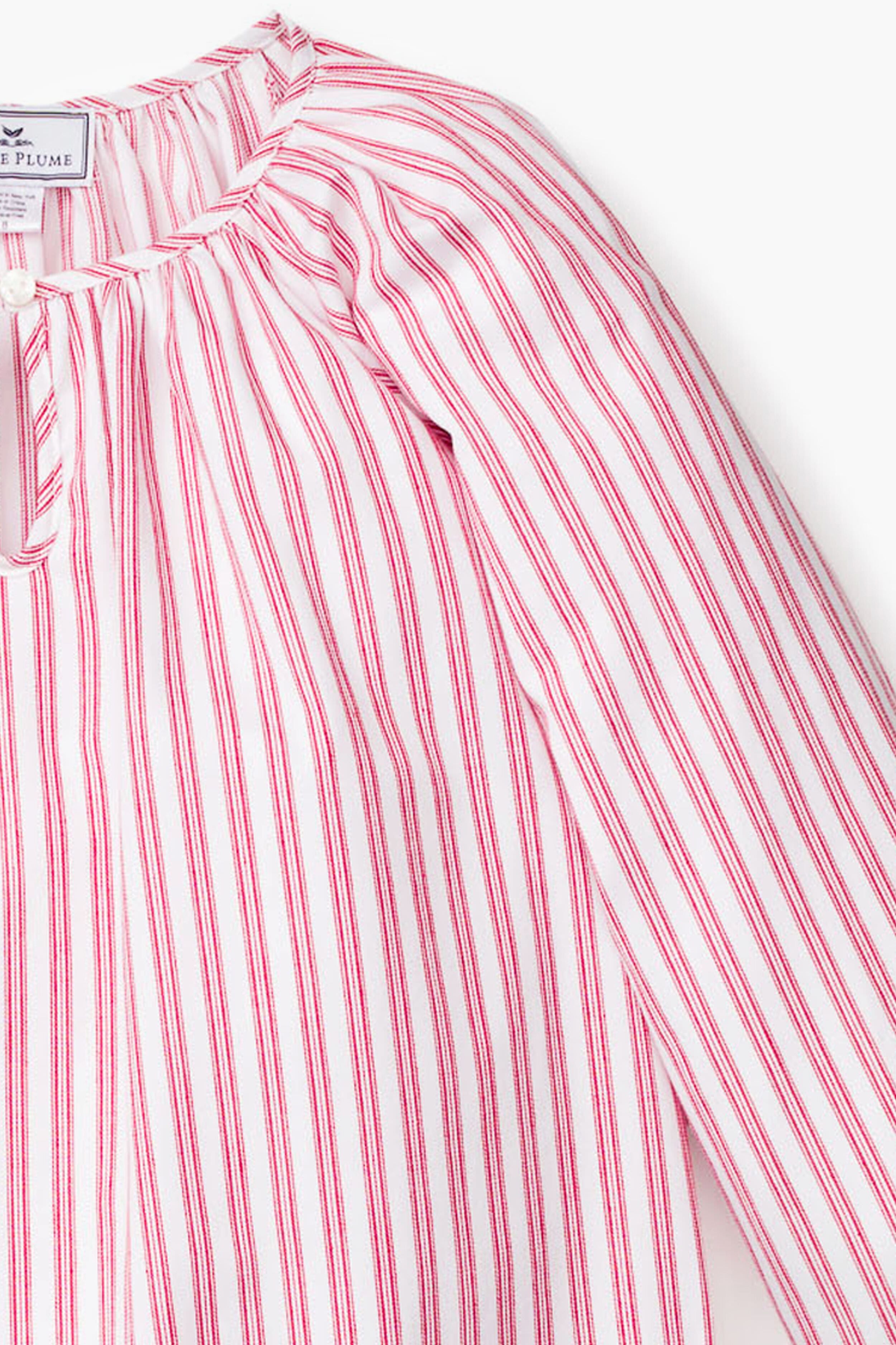 The Kids Antique Red Ticking Delphine Nightgown showcases a classic print that will never go out of style. This cozy pajama piece shows attention to detail with a lovely keyhole front with button closure and ruffled cuffs. The cotton fabric is light. soft and breathable – so we know your little one will appreciate this comfy nightgown.