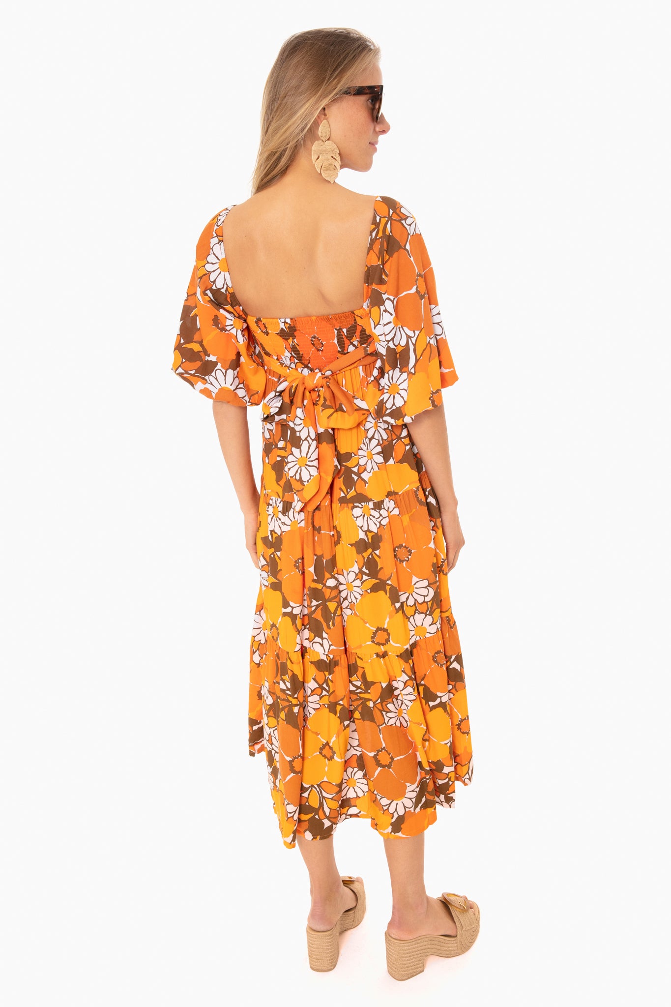 Designed in a vibrant orange floral print. the Kiona Midi Dress has a free-flowing. tiered hem. puff sleeves. and a concealed side zip. With a flattering square neckline and bow at the back. this style is bright and feminine. Pair with sunglasses and raffia accessories for the perfect sunseeker look!