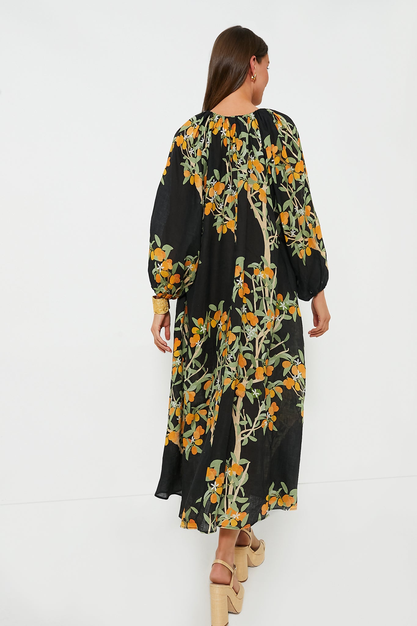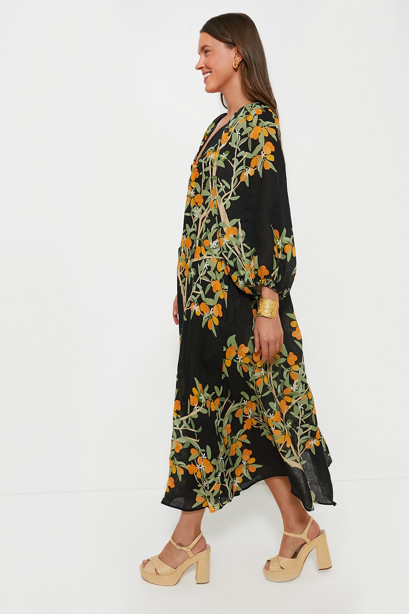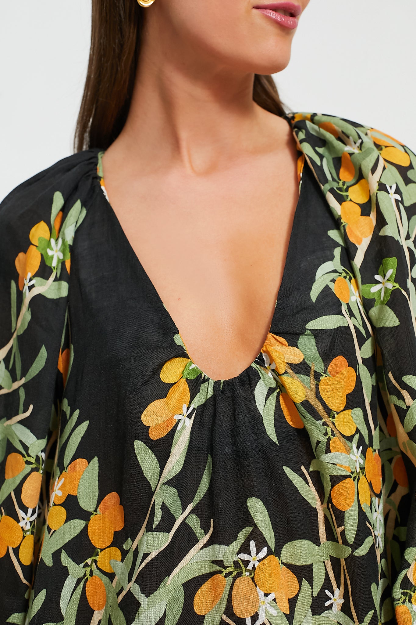 The Kumquat Georgette Dress is a chic. eye-catching number. Cut from linen and printed with a pattern depicting kumquats. this midi has an elegant v-neckline and falls in a floaty shape. longing for tropical destinations and sunny beaches. Pair with heels and clutch for added drama!