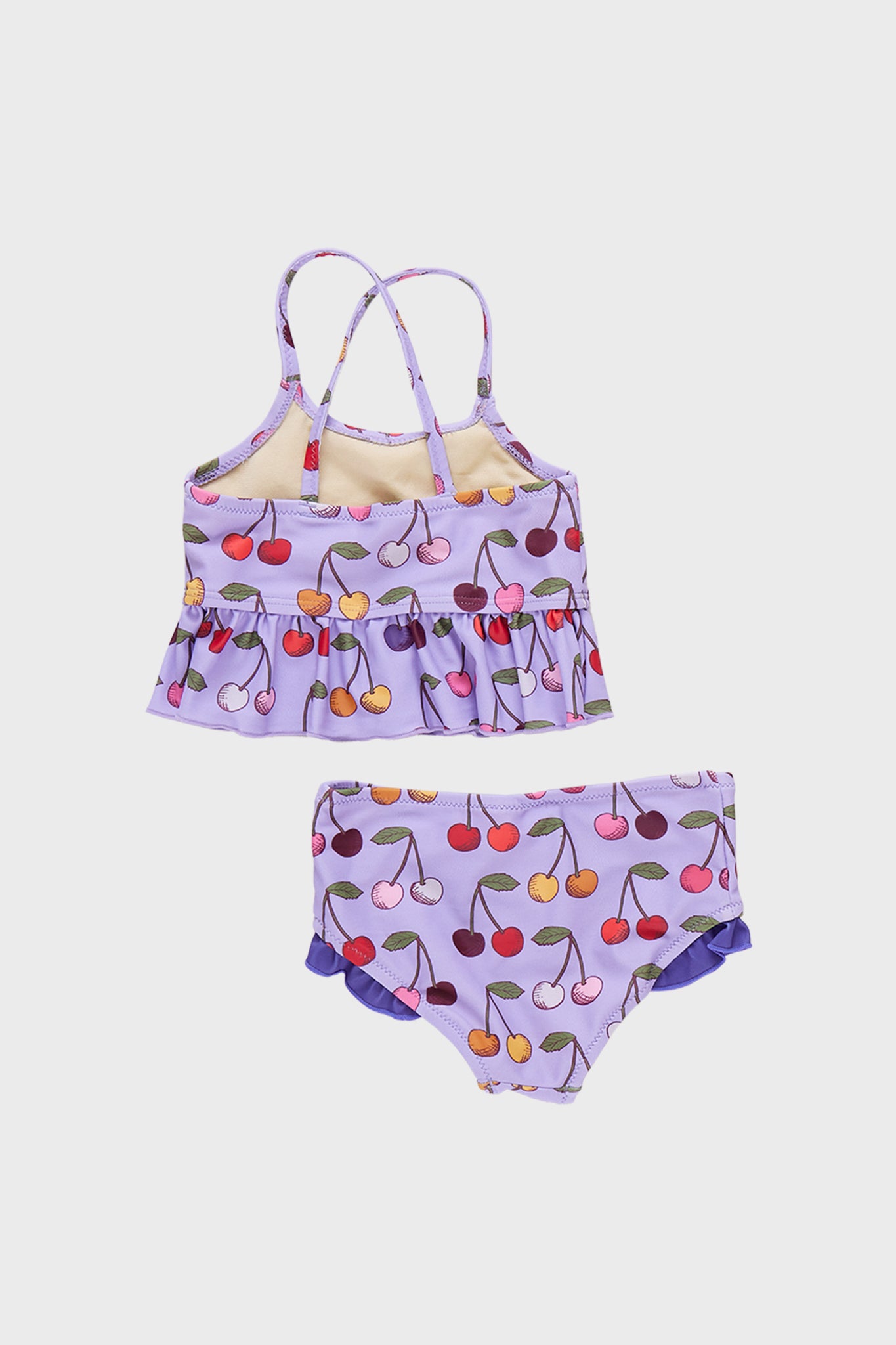 The Lavender Cherry Joy Tankini lights up with a colorful array of cheery cherry twins on a lavender ground. A generous ruffle hem and criss-cross shoulder straps define the charming top and a coordinated ruffle at the leg adds a fun touch on the bottom. This delightful duo feels right at home at the beach. a lakeside retreat. or poolside at home or on vacation.