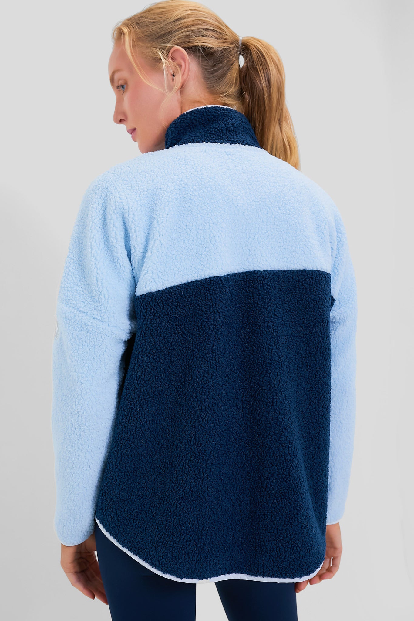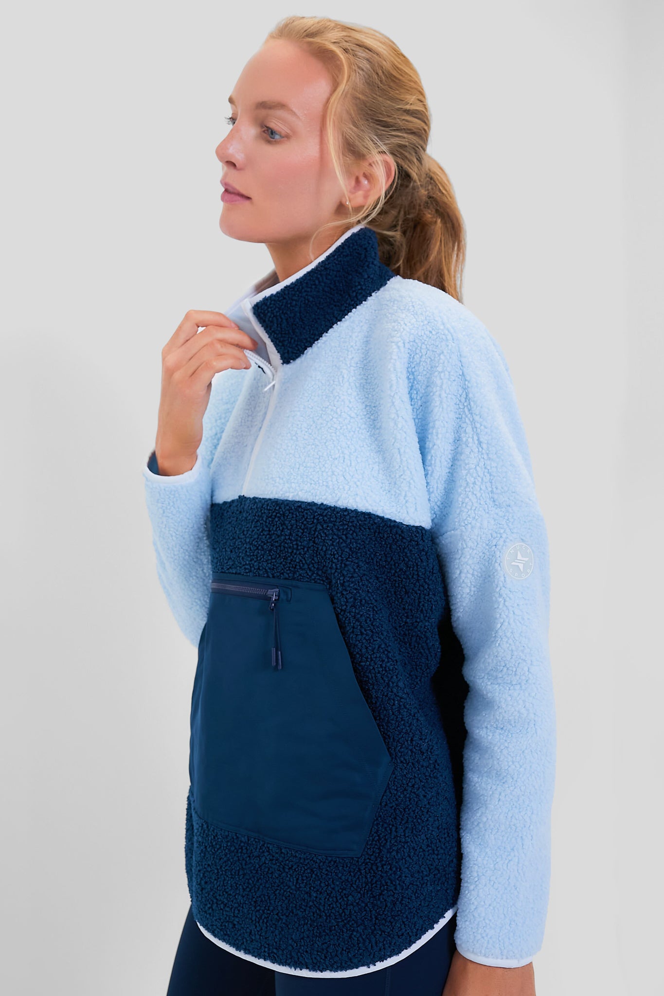 The Light Blue and Navy Cady Quarter Zip is a cozy pullover style that is equal parts easy and elevated. With a fleece exterior. front kangaroo pouch pocket. and contrast color stripe on the yoke and sleeves. this can be paired with everything from jeans. to tennis skirts. to leggings!