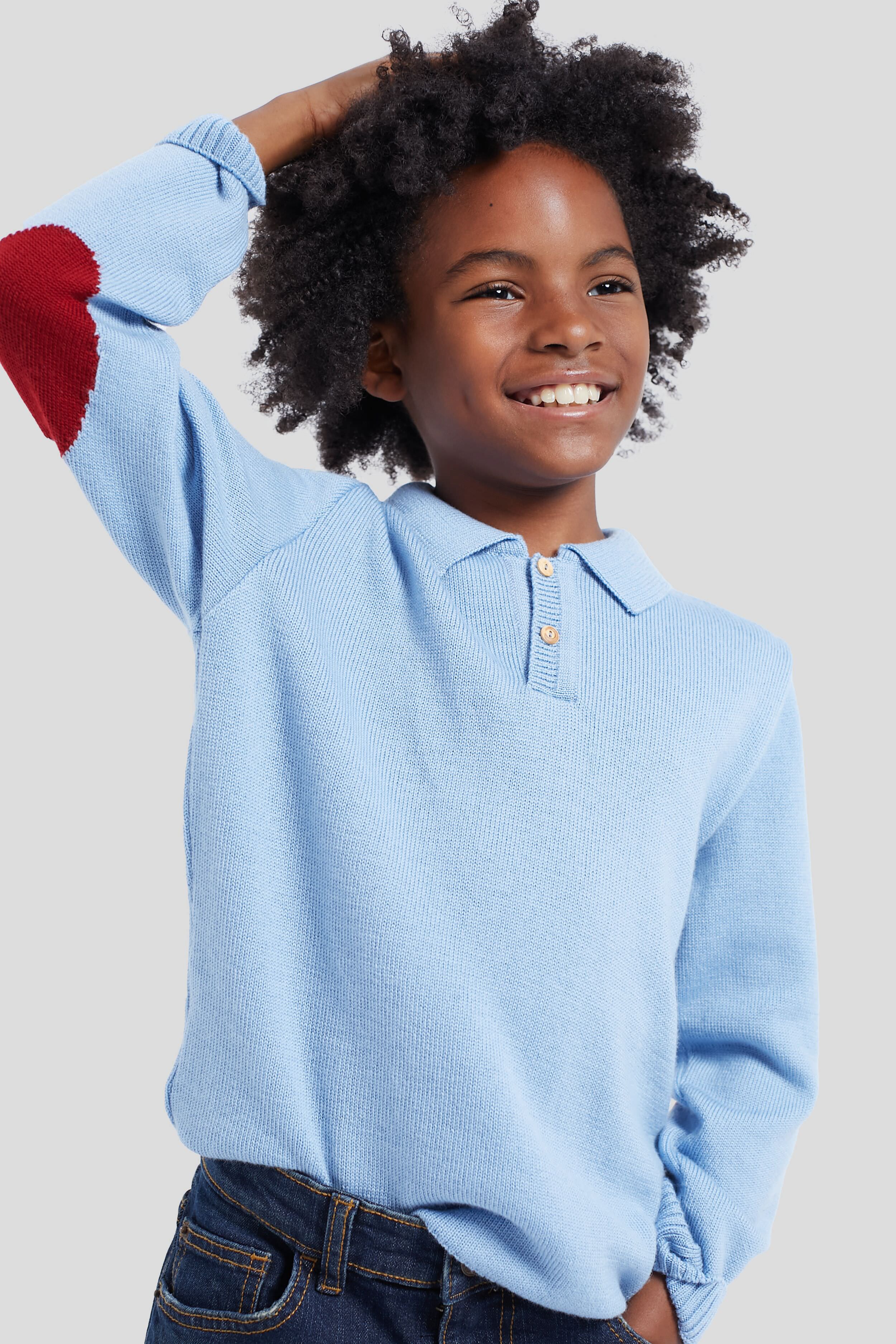 The Brio Merino Jumper strikes the balance between effortless sophistication and versatility. drawing inspiration from classic polo shirts for a collegiate. preppy feel. Featuring a timeless. relaxed design finished with a knitted collar. ribbed hems and cuffs. a handcrafted wooden button placket. and intarsia elbow patches in contrasting burgundy. This jumper is both school-friendly and elevated for weekend wear!
