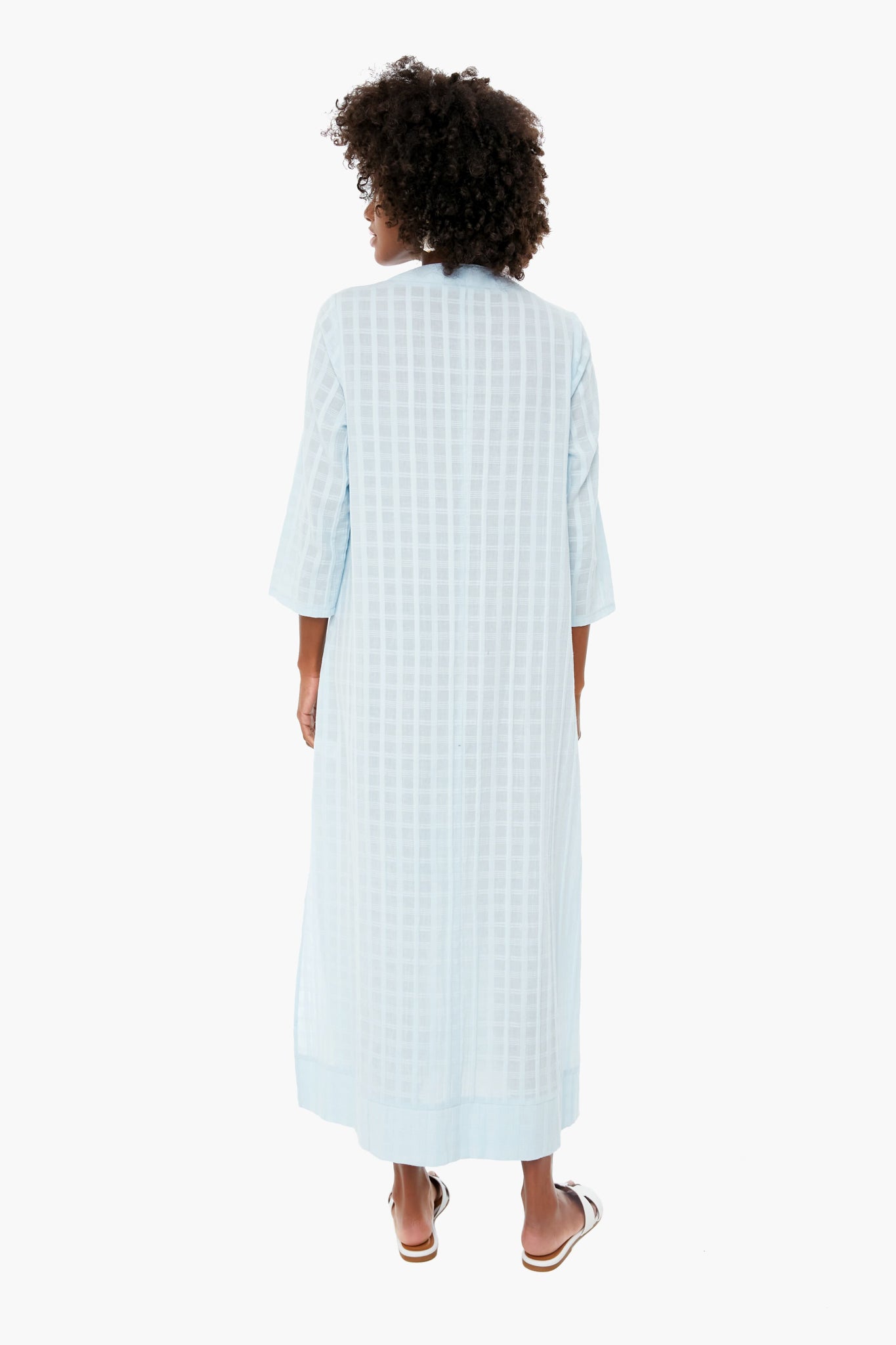 The Carolina Caftan is a warm-weather essential. This breezy. A-line style features windowpane details. a notched V-neckline. slits at the hem. and faux pockets on the front. Add gold jewelry and espadrilles for a vacation-ready. bohemian vibe.