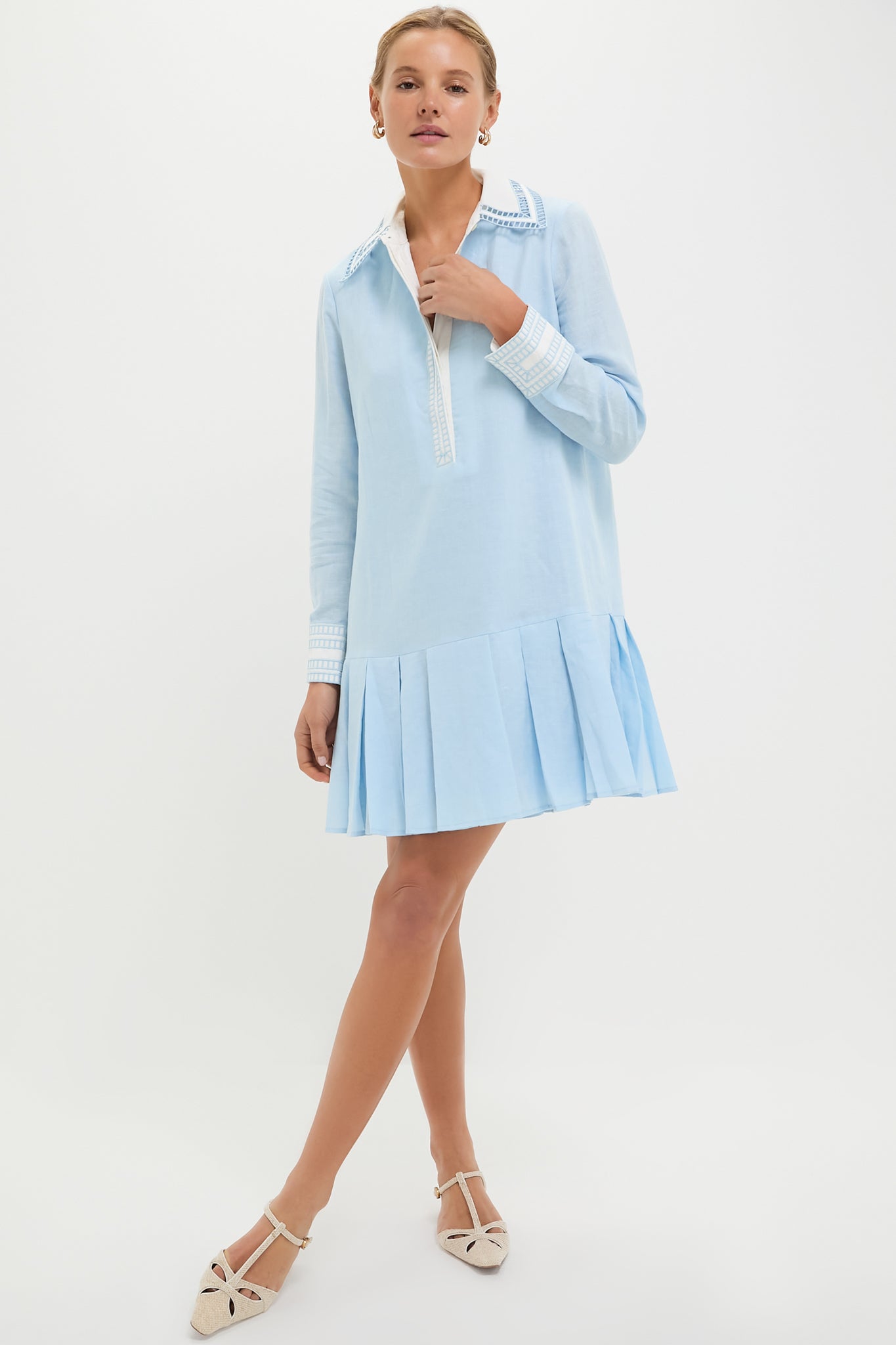 Soft. feminine. and effortlessly chic. the Light Blue Embroidered Collared Tate Dress is the ideal dress for the warm-weather months. With a sophisticated collar and breezy pleated hem. it's the perfect pick for garden parties. brunch dates. or sunlit strolls. Pair it with gold hoops and strappy sandals for a stylish look.