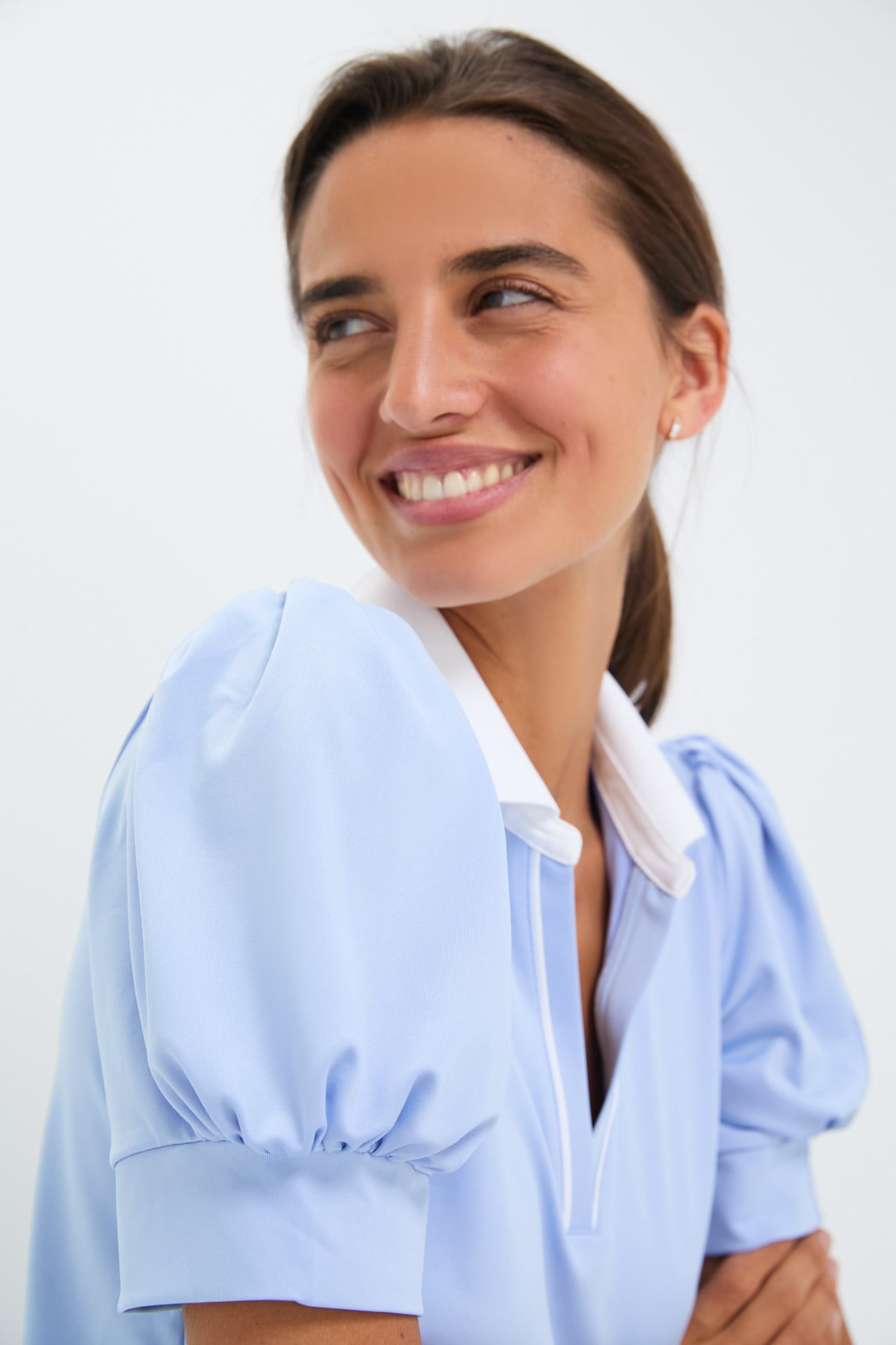 Prep for the U.S. Open (or a coffee run) in the Puff Sleeve Caroline Polo. With an open collar. puff sleeves. and a high low hemline it has feminine details that make this polo unlike any other.
