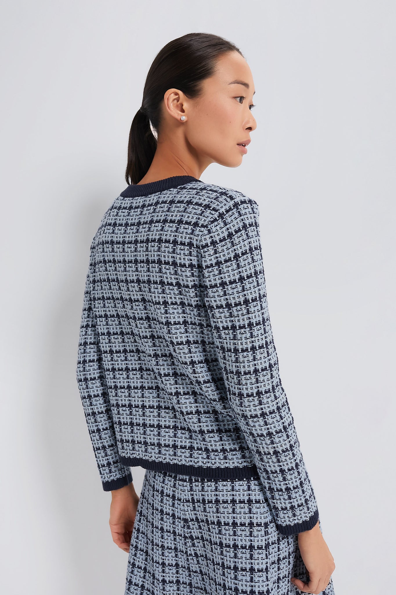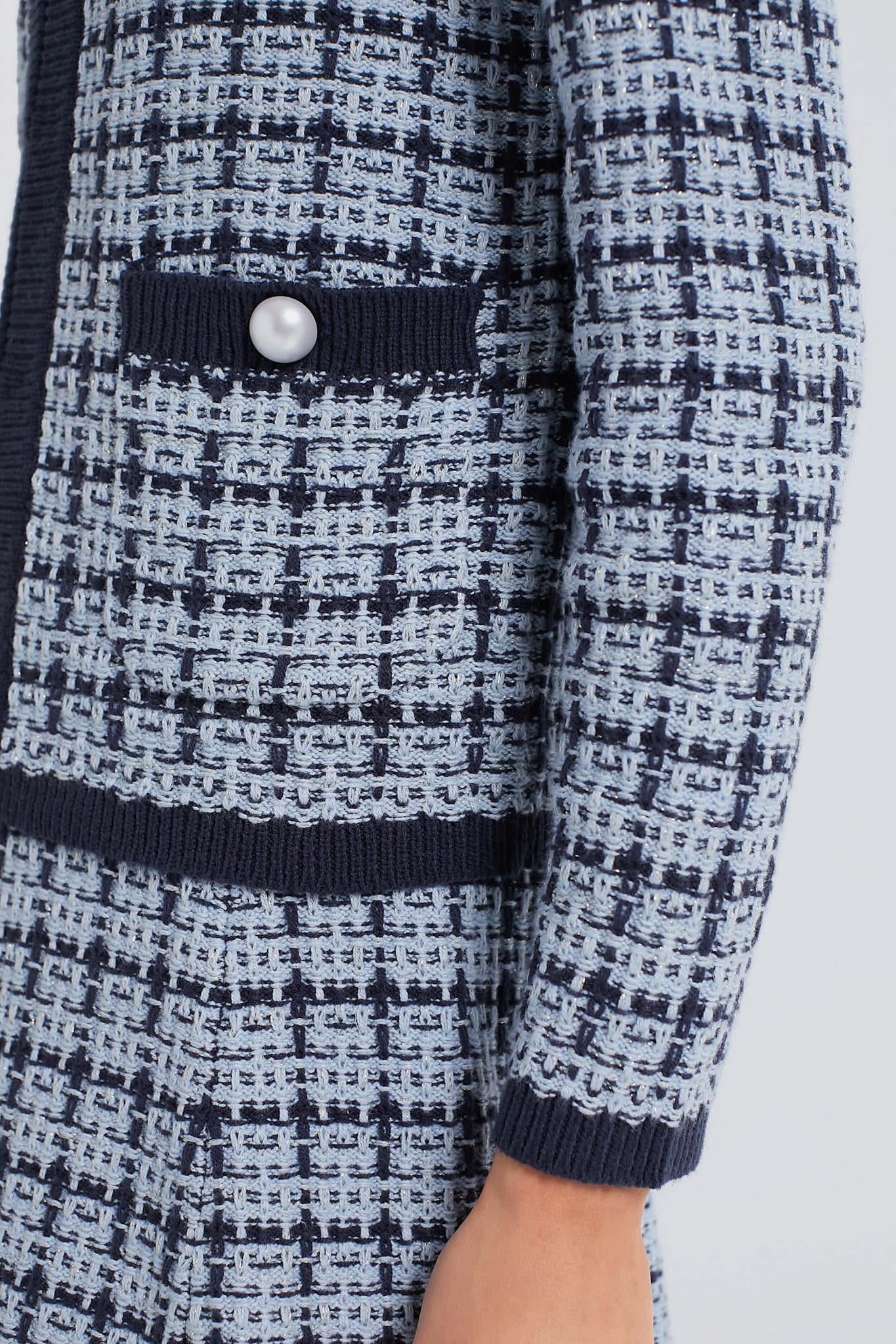 We adore the subtle metallic flecks. contrasting ribbed trim. and slightly boxy fit of the Light Chambray Braided Knit Jacket. Pairs perfectly with your favorite denim or wear it as a set with Light Chambray Pleated Knit Skirt to create the ultimate polished look.