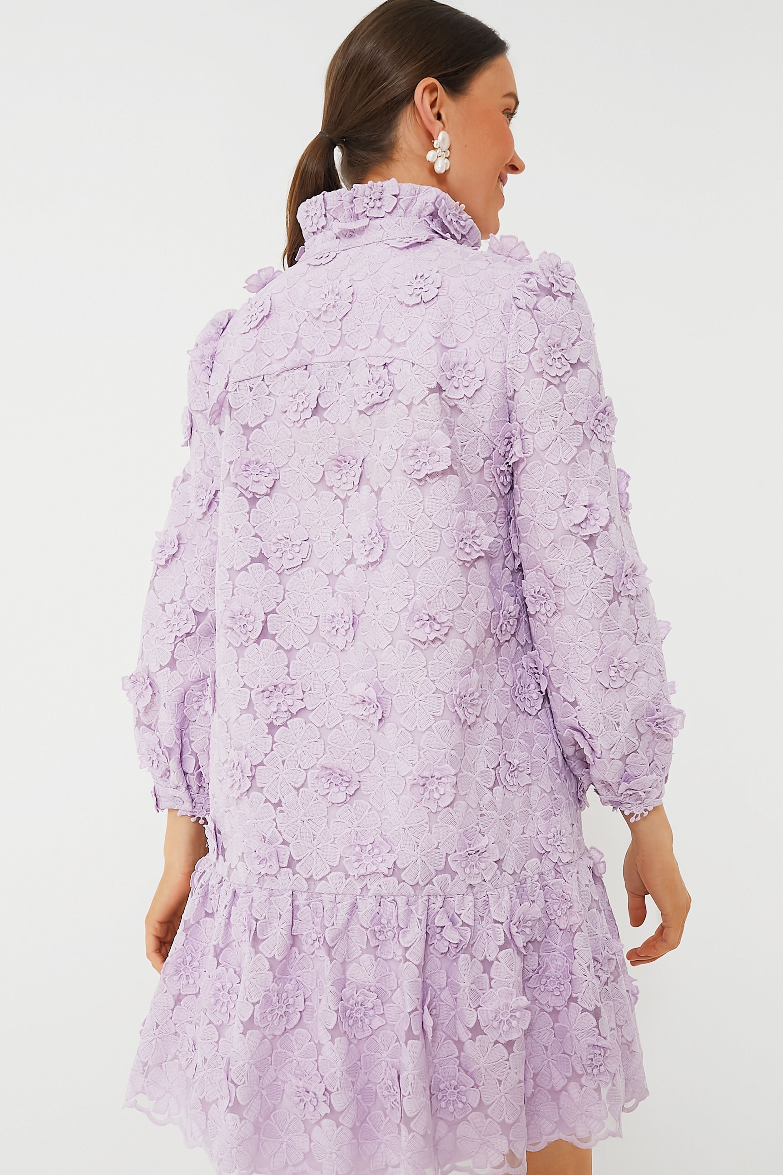 A feminine silhouette filled with movement and grace. the Lilac Lace Palmerston Dress is the dress of our dreams. A ruffled collar and long sleeves play for a sophisticated feel while the enchanting three-dimensional floral details add a whimsical texture that makes us want to twirl all night long. Pair with heels and pearl earrings for an upcoming wedding. shower. or dinner party!