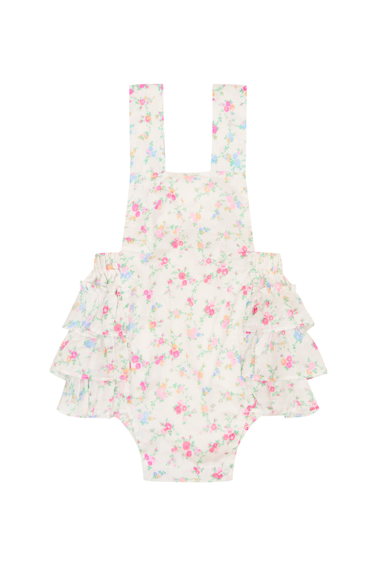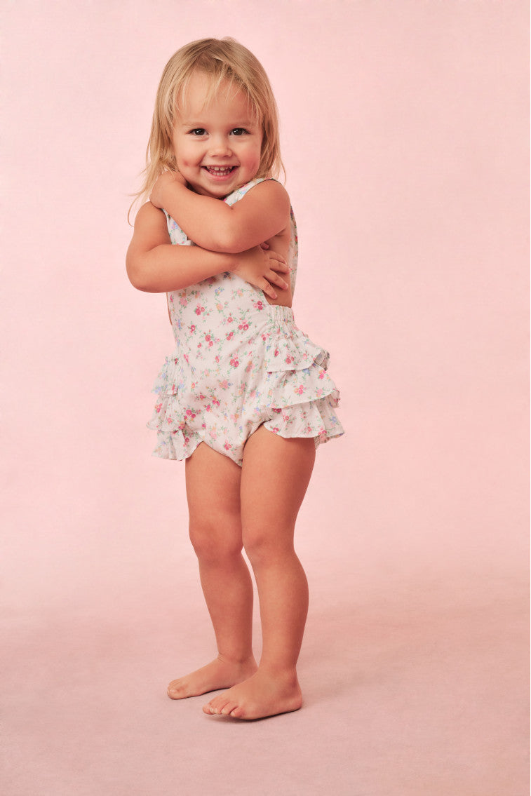 Our Lindy Pinafore is extra cute for our little loves. This charming one-piece features our new. signature floral print and playful ruffle details at the leg openings.