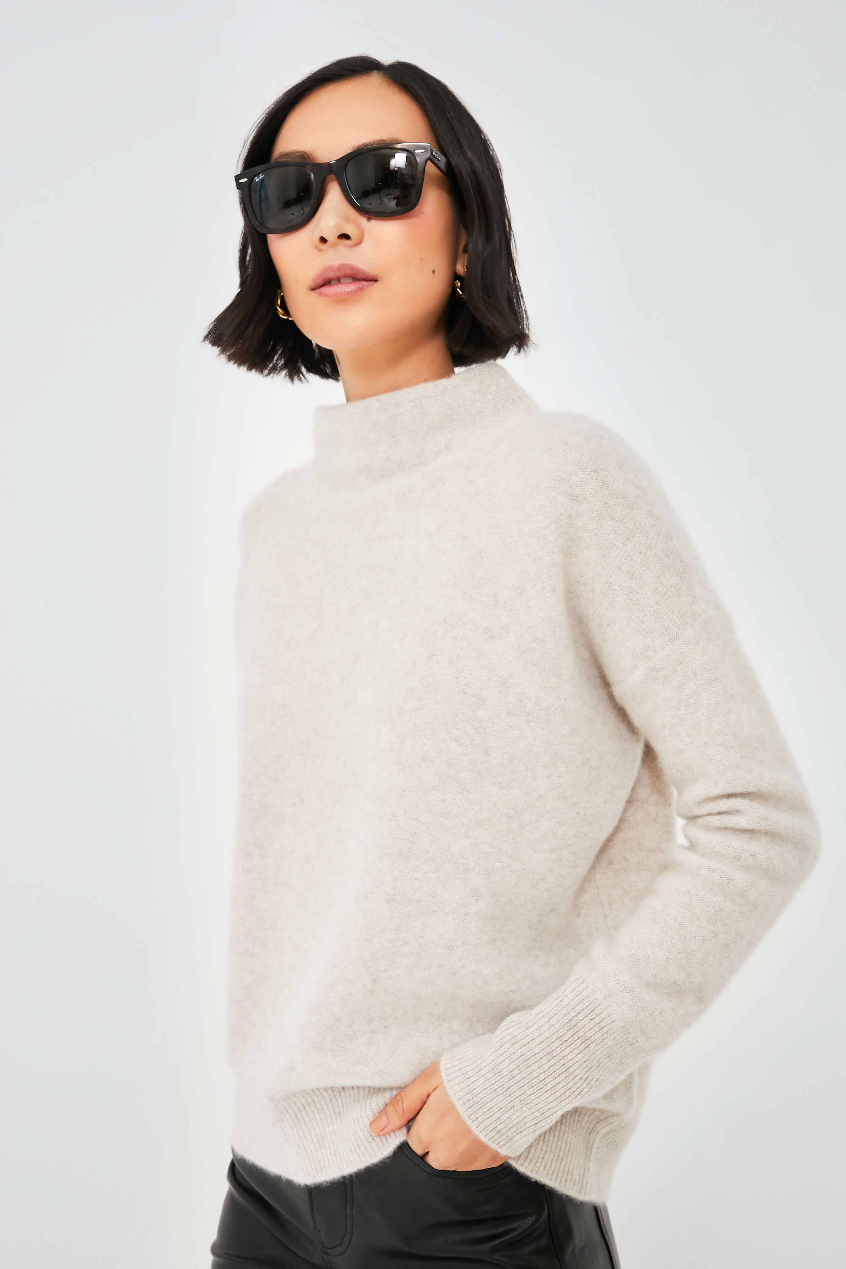 Beautifully crafted from unbelievably soft cashmere. the Marble Sweater is sure to be an instant wardrobe favorite. Featuring a funnel neckline. dropped shoulders. and cozy ribbed detailing. this piece delivers the effortless and elegant silhouette of our dreams! We are wearing this top with denim or leather leggings and pairing it with boots. flats. heels. and more. Perfect for a lazy weekend lounging at home. or for a dinner party with friends. this timeless silhouette can do it all.