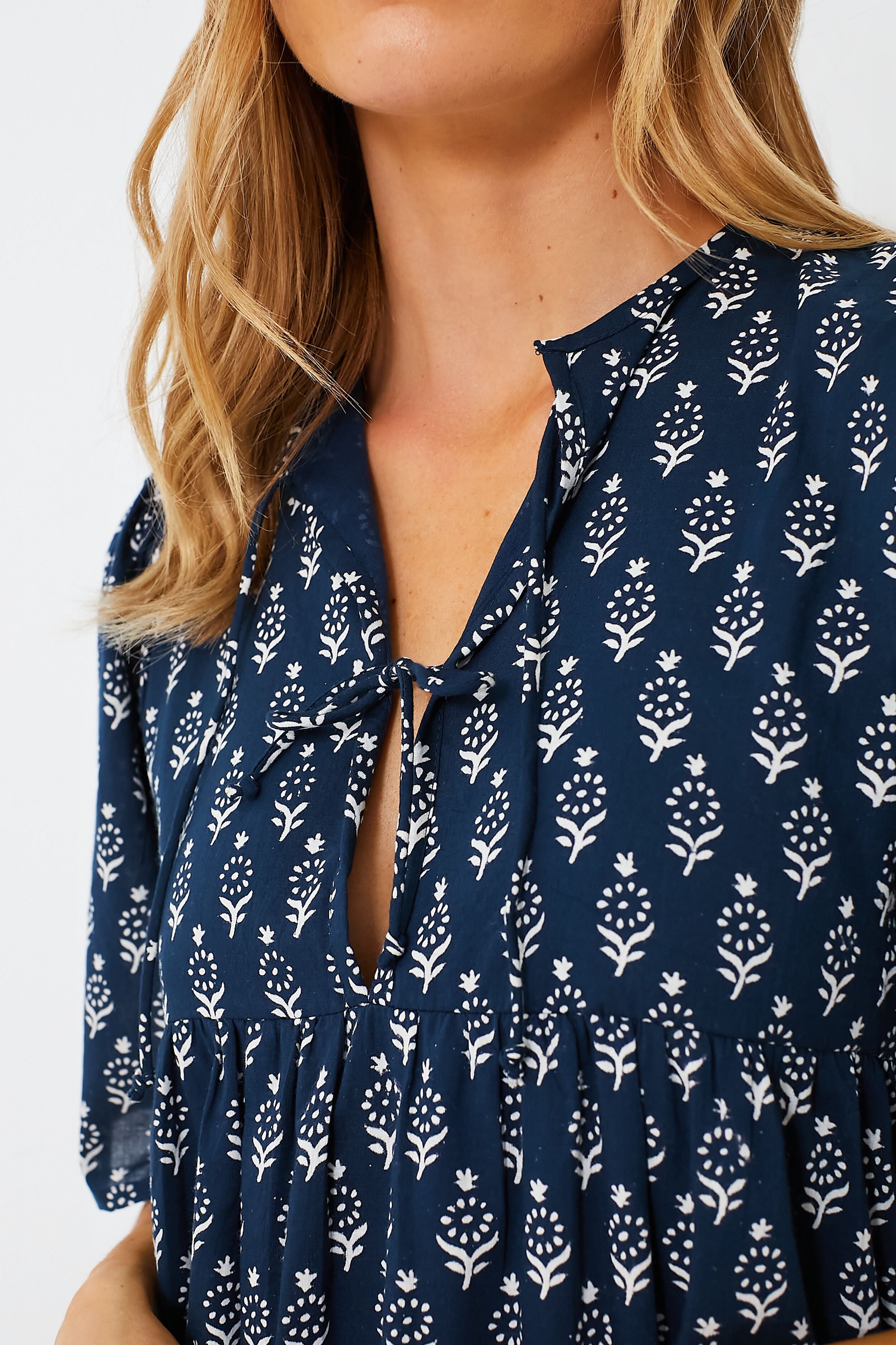 It's always a good idea to have a light and breezy mini in your closet to throw on when it's hot out! A go-to silhouette that ticks all the boxes. the Marguerite Blue Isla Dress is easy to wear and easier to love. With a deep navy hue and a fun block print that is begging to be worn to the beach (or to the beach bar!). this number features tassel ties and a tiered skirt full of movement. All you have to do is add sandals and sunnies. then you're ready for lounging poolside. walking the boardwalk. or grabbing a refreshing drink.