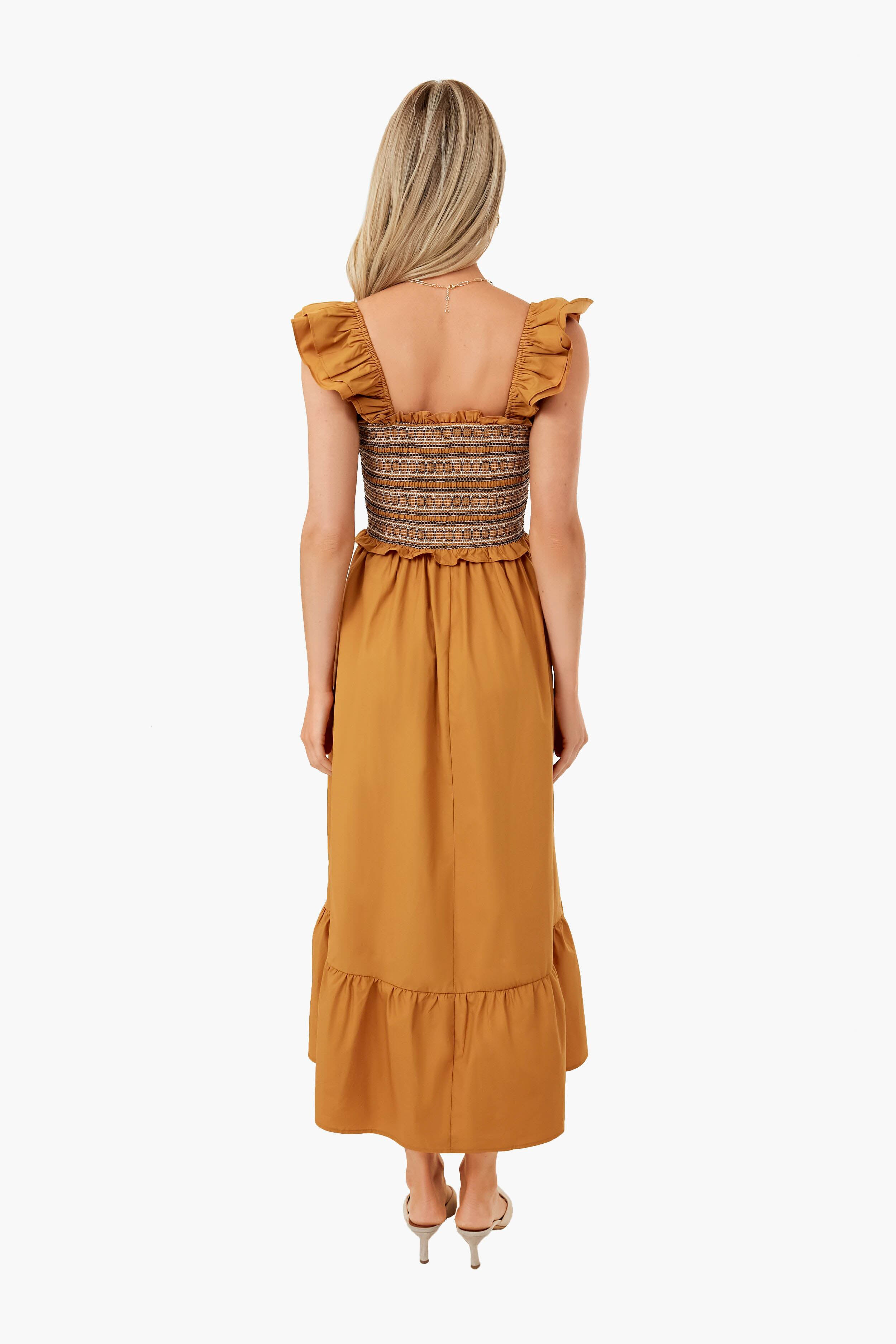 Cut from crisp cotton poplin in a deep yellow. the Marigold Penelope Dress is a transitional piece perfect for helping you ease from summer into fall. A square neckline with a smocked bodice makes this midi cozy and comfortable. while flutter sleeves and a flounce hem add some fun! Wear it with sandals now. then switch to boots as the weather changes.