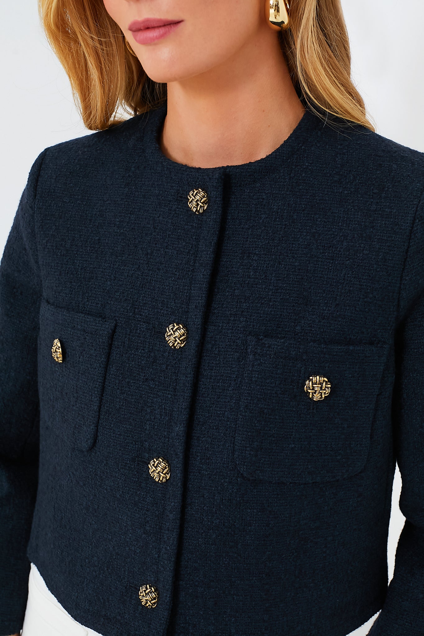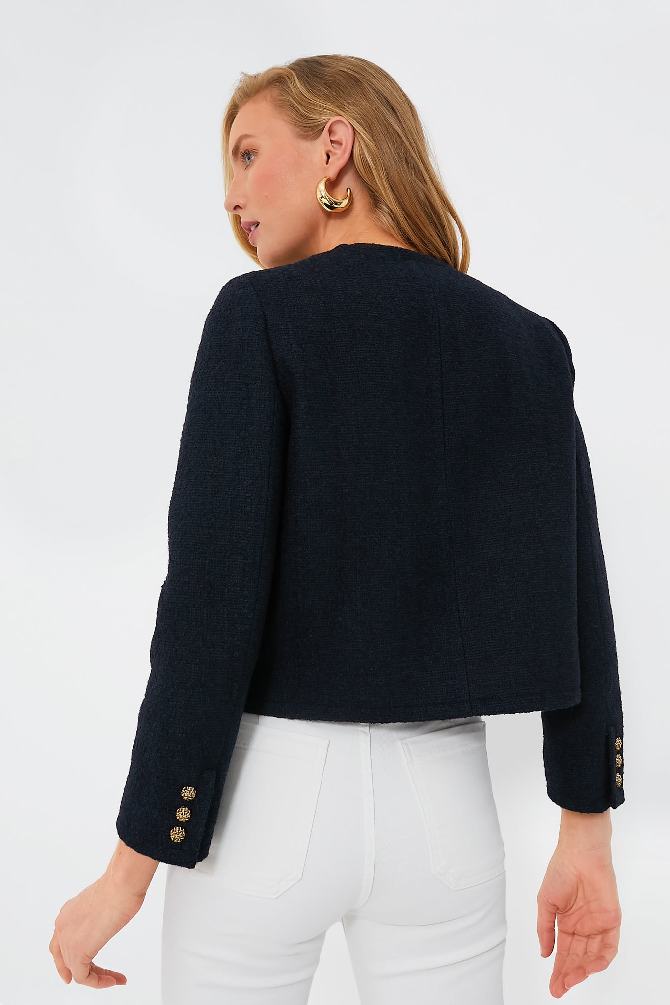 Loving the ladylike outerwear trend? Us too! The Marine Meredith Jacket takes our favorite components (think bracelet length sleeves and gold buttons). and adds a few fresh details (like a textured tweed fabric and a cropped hem) to create an elegant yet modern look we can't get enough of. Pair it with denim and loafers for a classic look that is sure to suit any occasion. or get a little flirty and style it with a mini skirt and strappy heels.