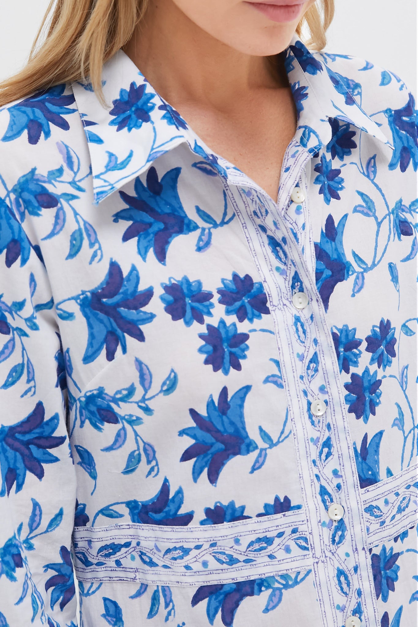 The Marion Blue Shirt Maxi Dress is Oliphant's take on a classic silhouette. Hand block printed florals witha. contrast trim invite you to make a statement at any occasion. We are dressing it down with sandals and a tote or elevating it with heels and gold jewelry!