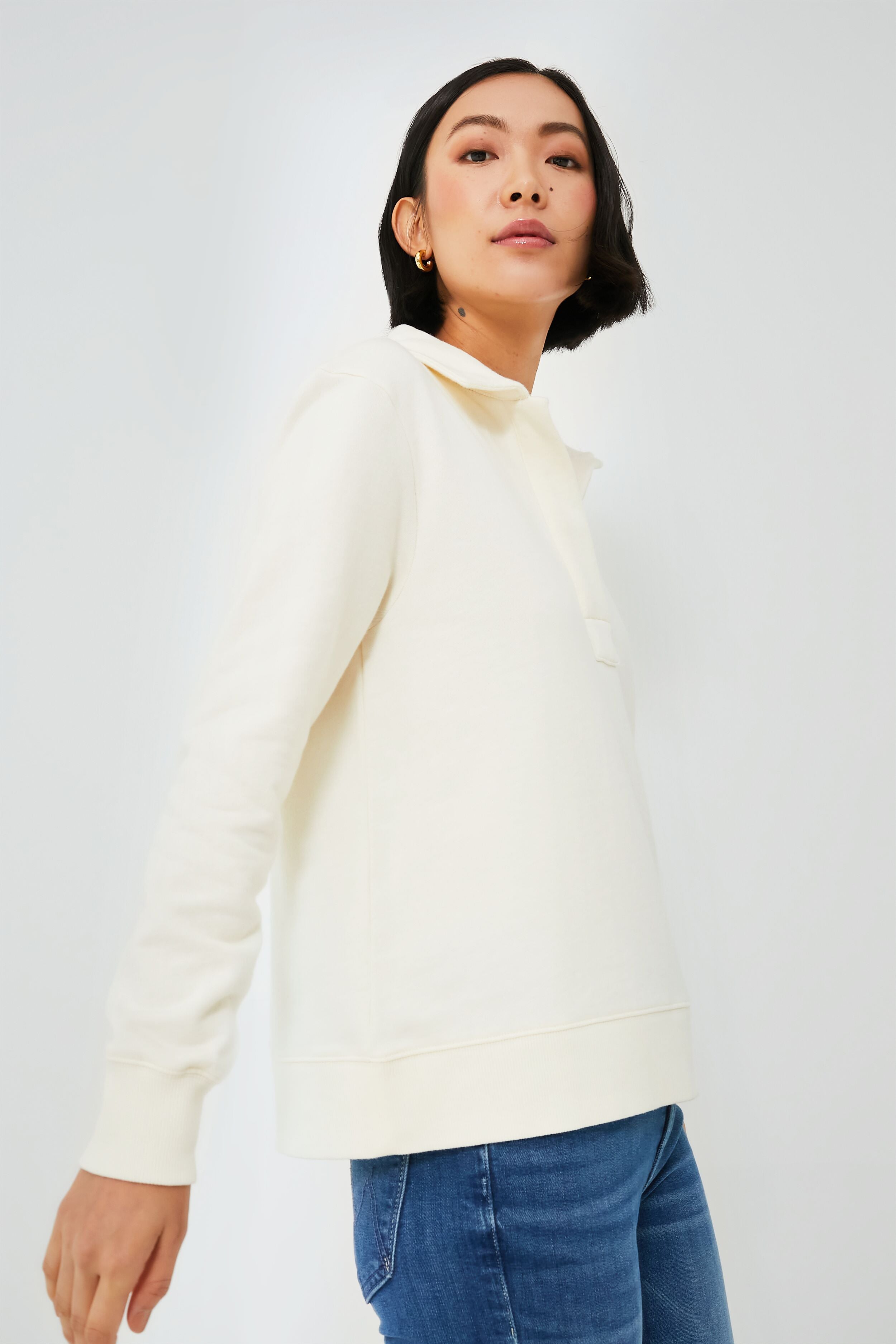 The Marshmallow Polo Popover Sweatshirt is as comfortable as it gets! Beautifully crafted in a cream hue. this cotton silhouette features a flattering V-neckline. long sleeves. and ribbed detailing at the cuffs and hem. A great layering piece for chilly nights. this closet staple is an easy yes. Great for throwing on after a match on the court. or perfect for weekend adventures. just pair it with denim and gold accessories.
