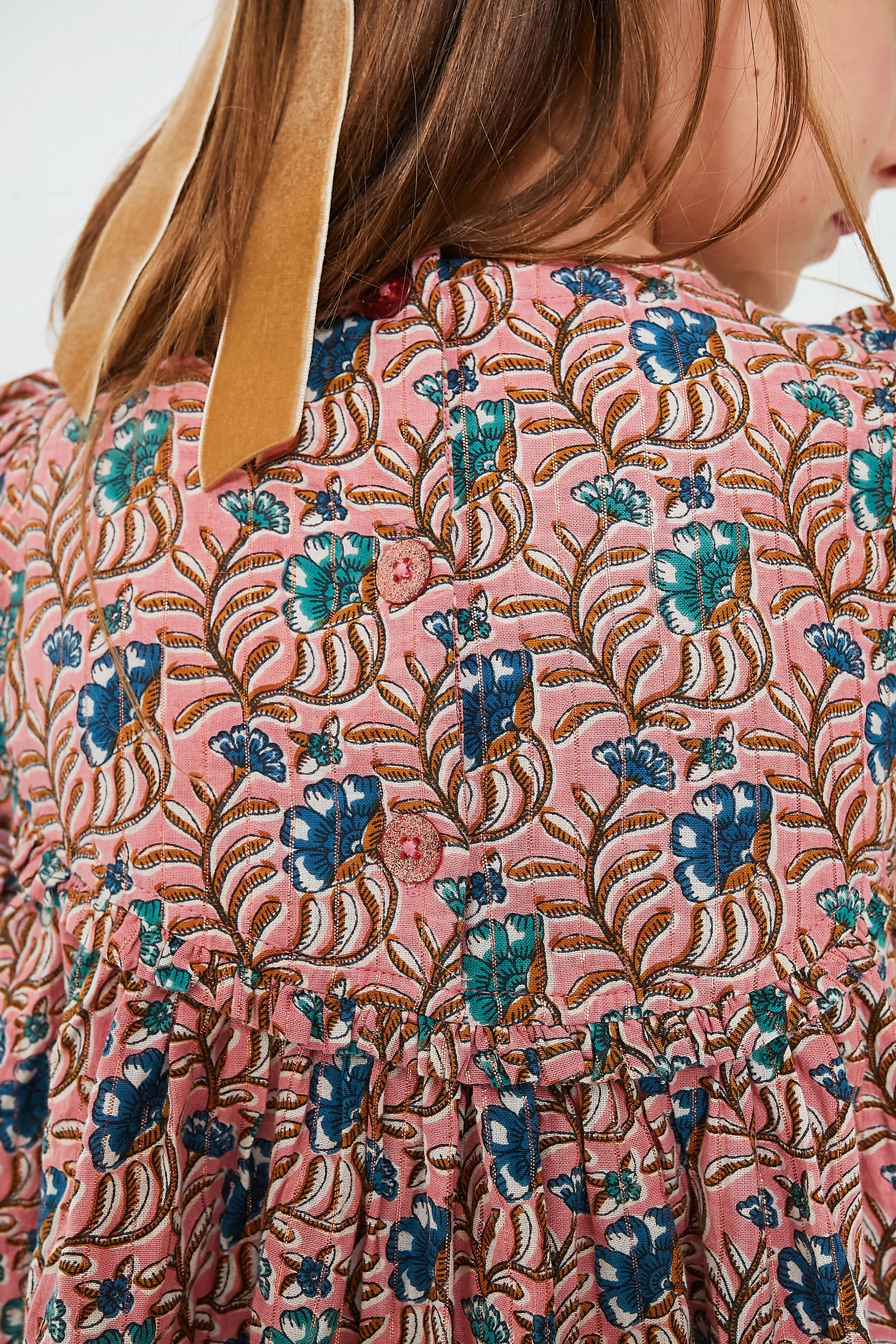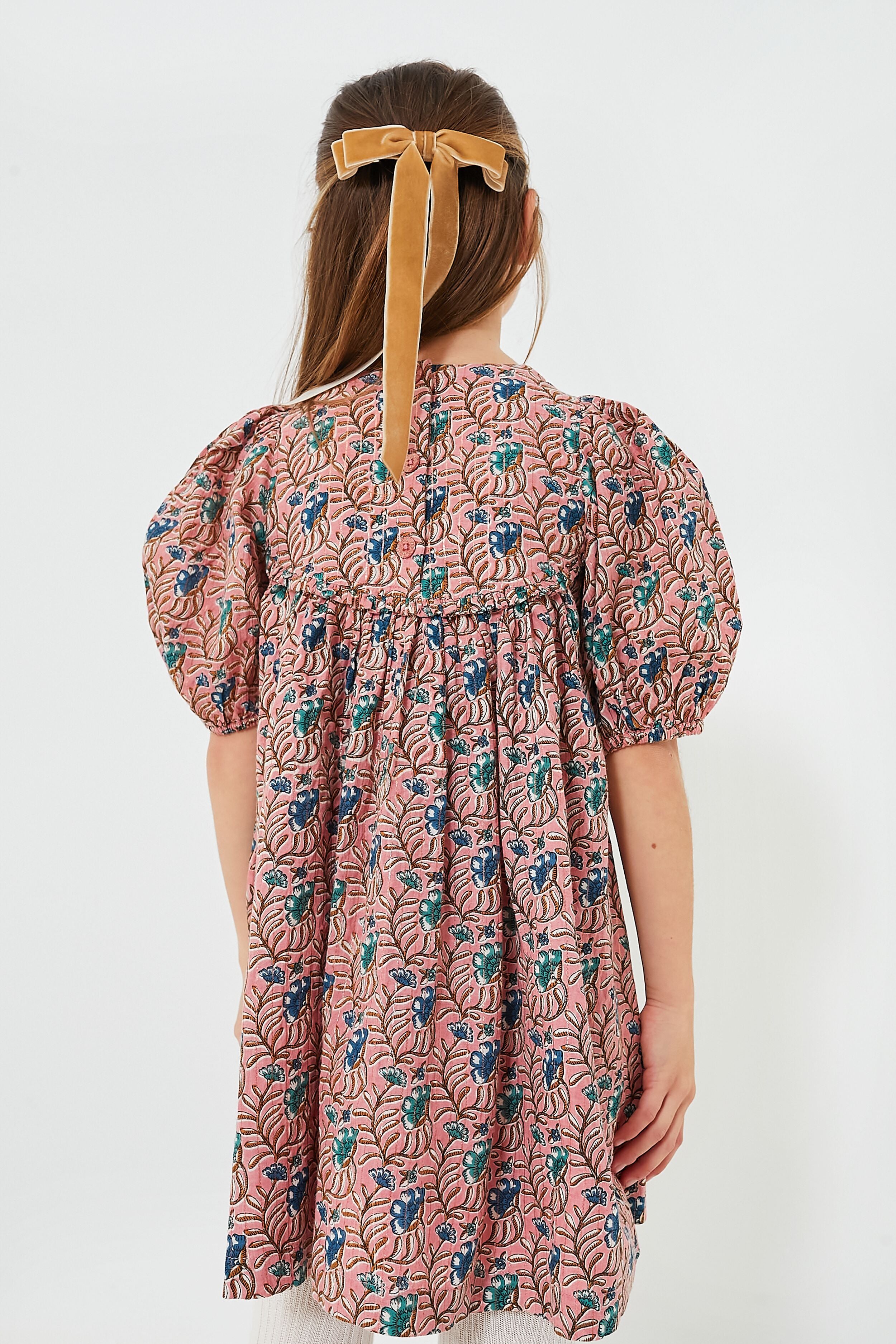Jade and sapphire blossoms grow wild against a dusty pink canvas upon the Mauveglove Vine Floral Rowan Dress. With a short puff sleeves. glittery buttons at the back. and lurex thread woven throughout for a touch of shimmer. your little girl is sure to love this sweet silhouette. Dress it up with a headband for family photos or weekend brunch. or dress it down with sneakers for time spent at the playground!