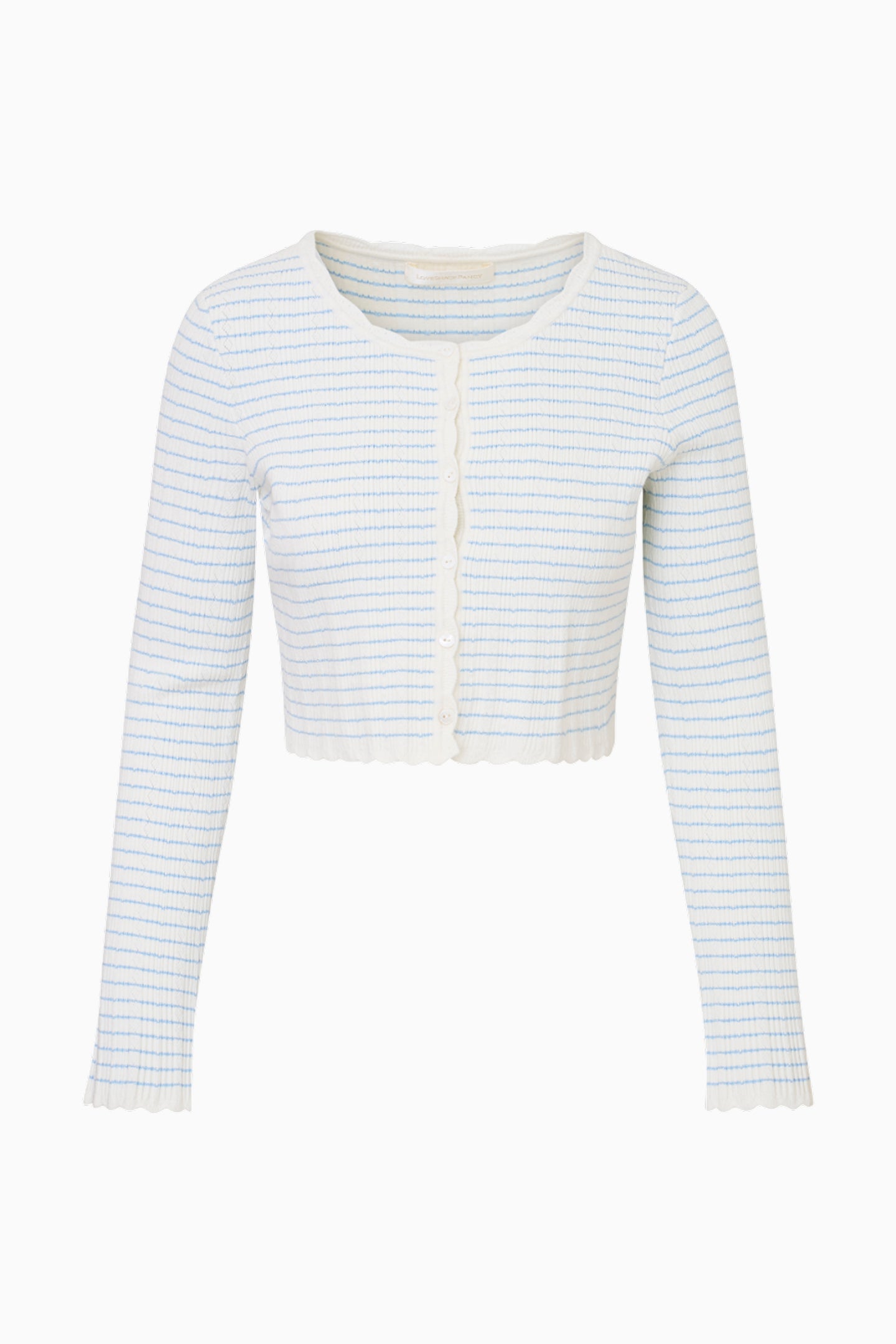 Introducing the Media Cardigan. This lightweight layer debuts with our best-selling pointelle yarn with a nice stretch and extra soft feel. With an all-over rib pointelle. the cardigan has little stripes knitted throughout with lurex for our signature shimmer. The sweater has a slim crop fit. pointelle scallop edges. and a pointelle scallop placket adorned with our custom bow shell buttons down the front.