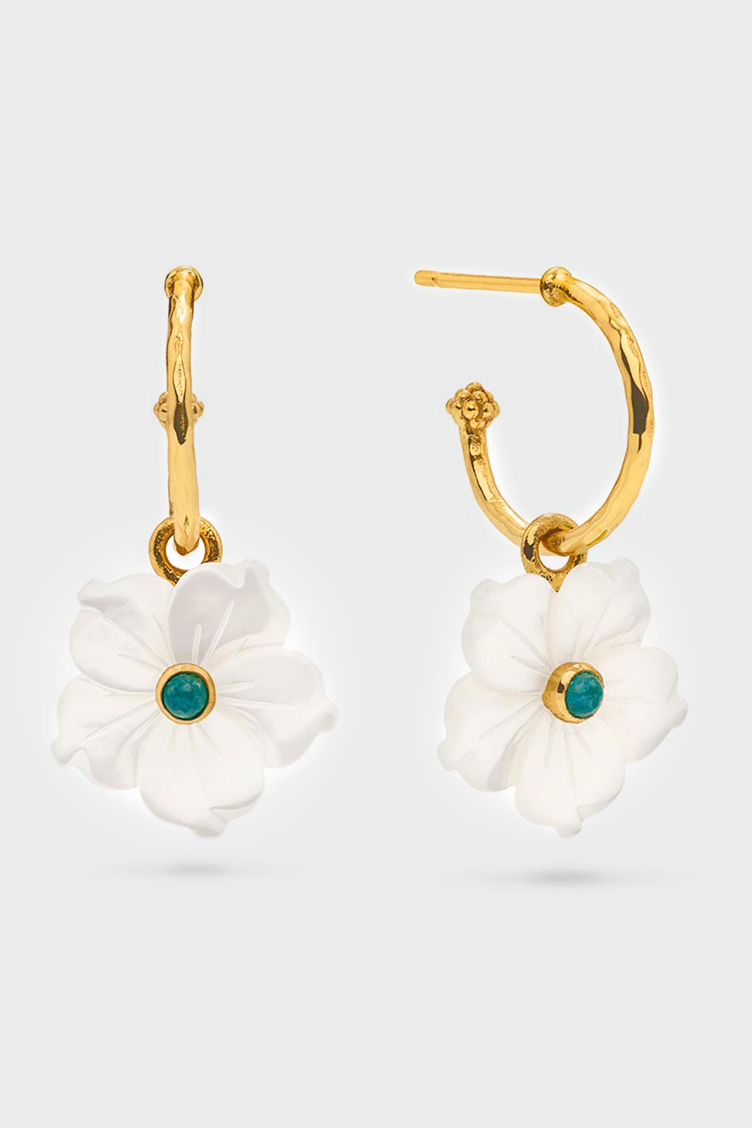 The Mermaid Garden Hoop Earrings with Flower Charm features mother of pearl flowers dangling sweetly from classic golden hoops that hug your ear for a subtle sway of movement as you go about your daily adventures. Dripping with iridescence and charm. these darling buds of spring (and summer!) dress up or down any outfit. from the boardroom to a bridal party.