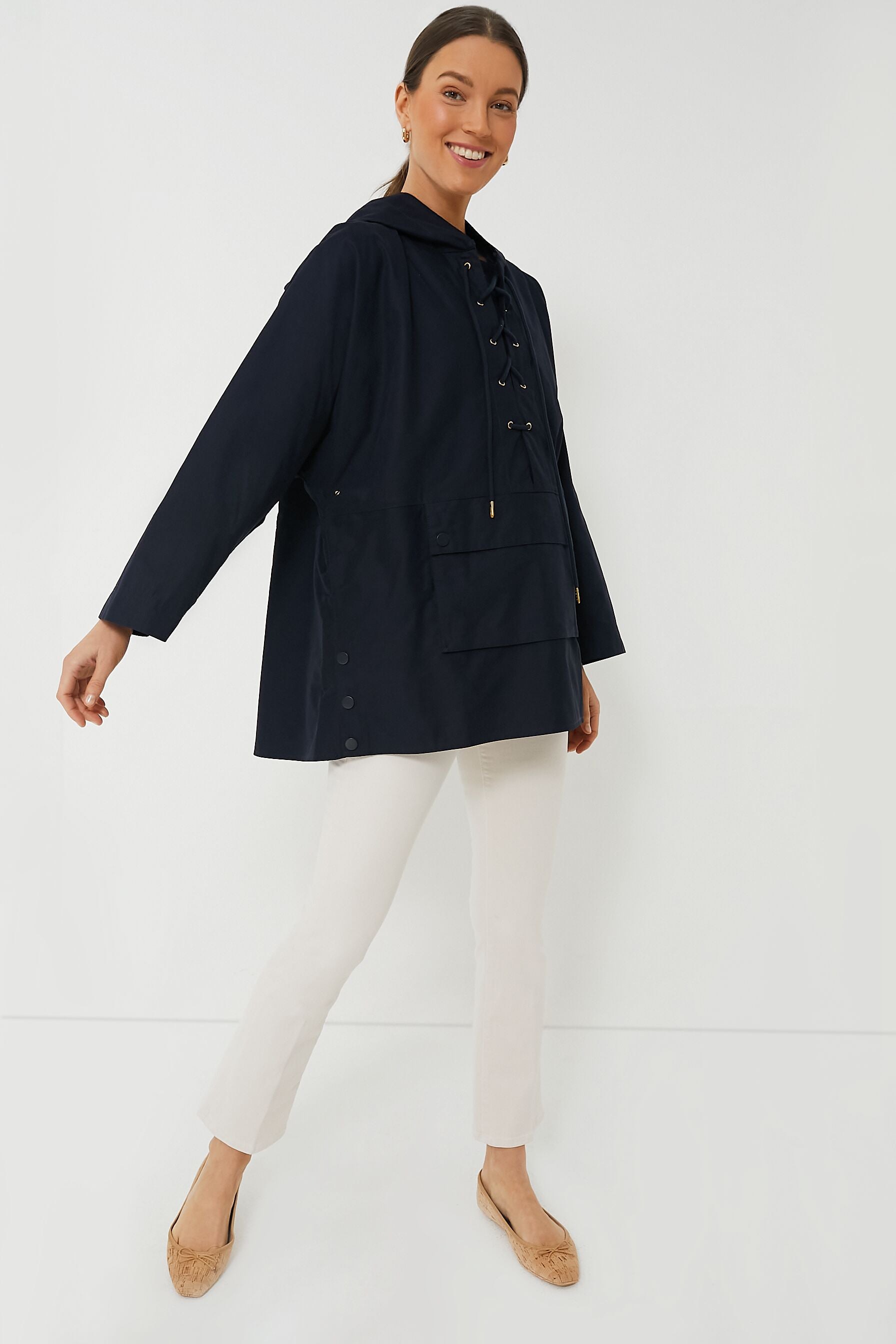 The ultimate in chilled-out daytime dressing. the Midnight Navy Sterling Pullover is that perfect throw-on-and-go style we are always searching for. In a surprisingly soft material that's lightweight enough for layering in transitional seasons. this cool silhouette features an attached hood. a fun lace-up front. and a functional kangaroo pocket at the front to hold your essentials. Pair it with denim and flats. leggings and a tote. or your favorite sneakers to give off an elevated yet casual vibe.