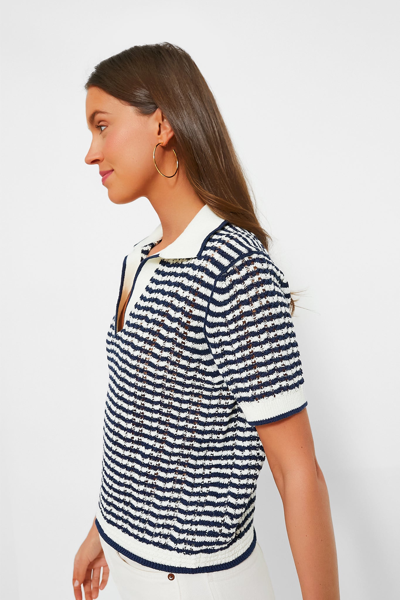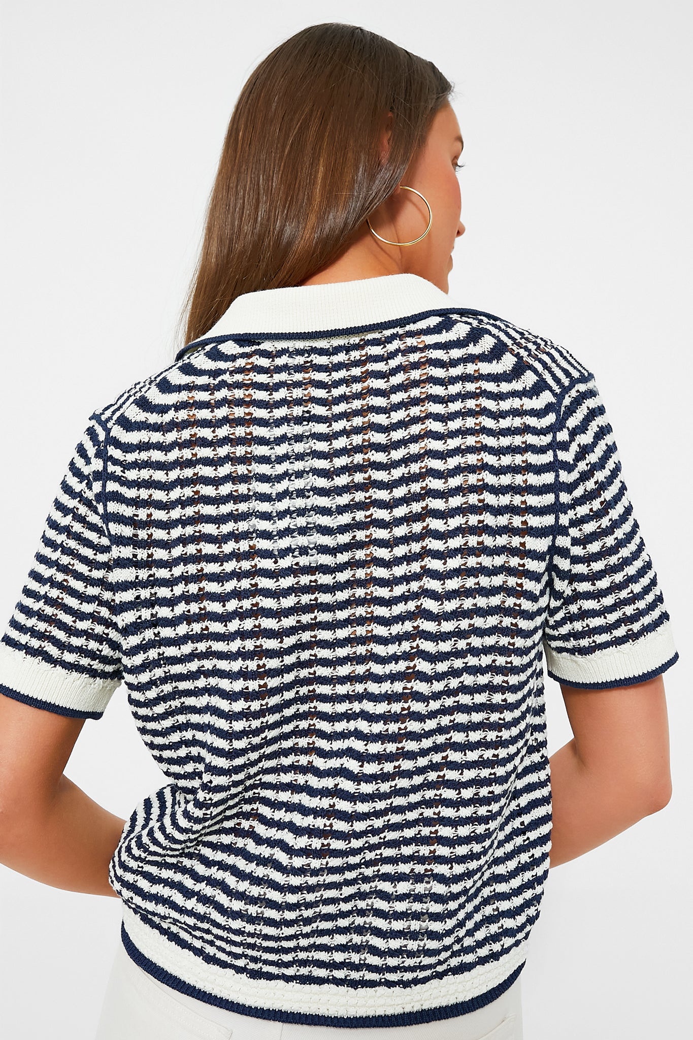 The Midnight Stripe Short Sleeve Polo is a classic style with retro-flare and flattering details. This knit top features a collared V-neckline. ribbed cuffs and hem. and a classic black and white pattern. We are styling this with white denim and sneakers for the summer. and under a blazer with black trousers for the cooler months.