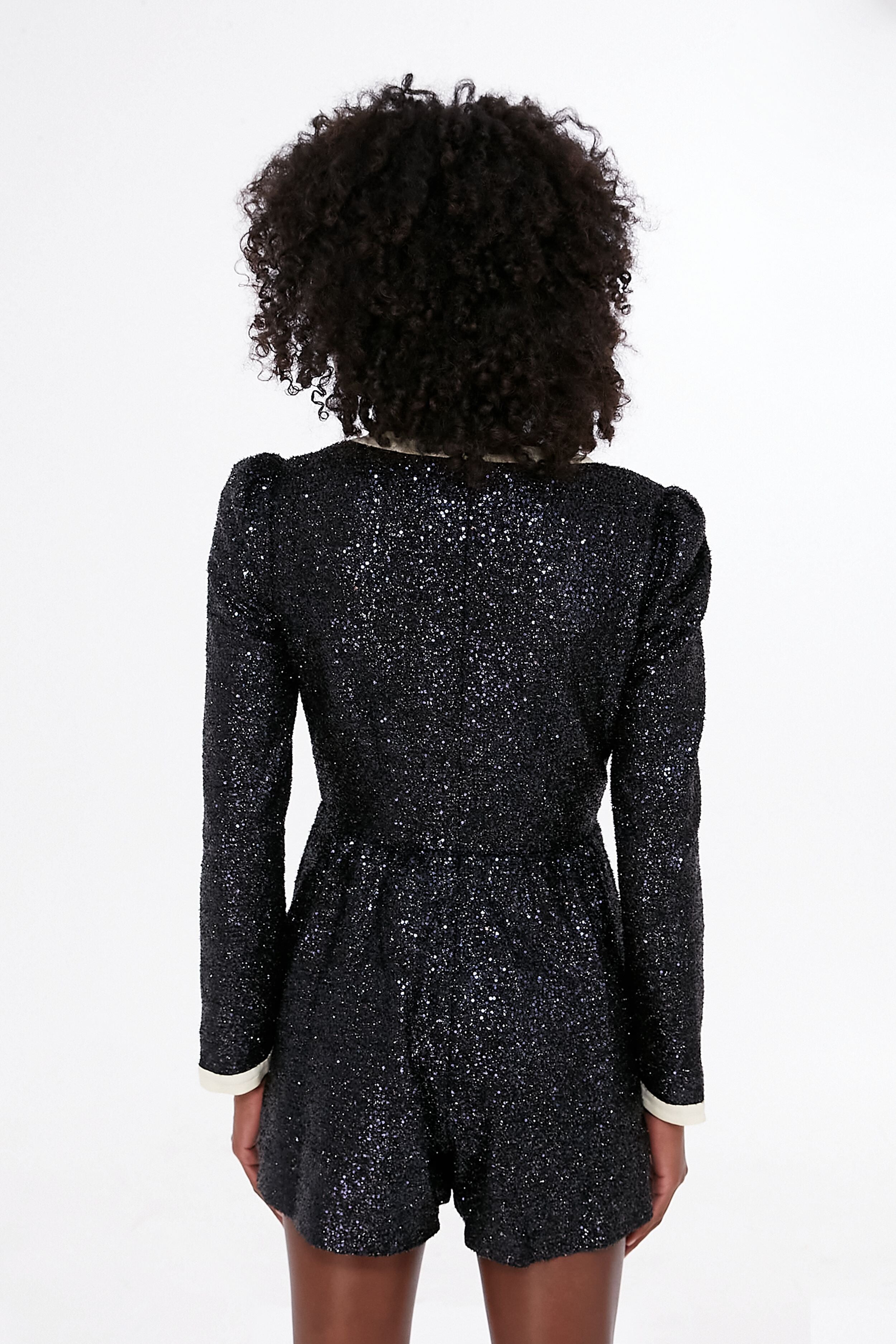 The Midnight Tinsel Camille Playsuit takes the brand's signature bows and applies them to a shimmering and sparkling jumpsuit silhouette that is ready for any party. Studded with sequins throughout. as well as diamante embellishment at the bows. this stunner with contrast trim. cutouts at the bodice. and side seam pockets is the height of glamour. There is no wrong way to wear this gorgeous style. so pair it with glittering metallic accessories or solid colored heels. and dance all night long.